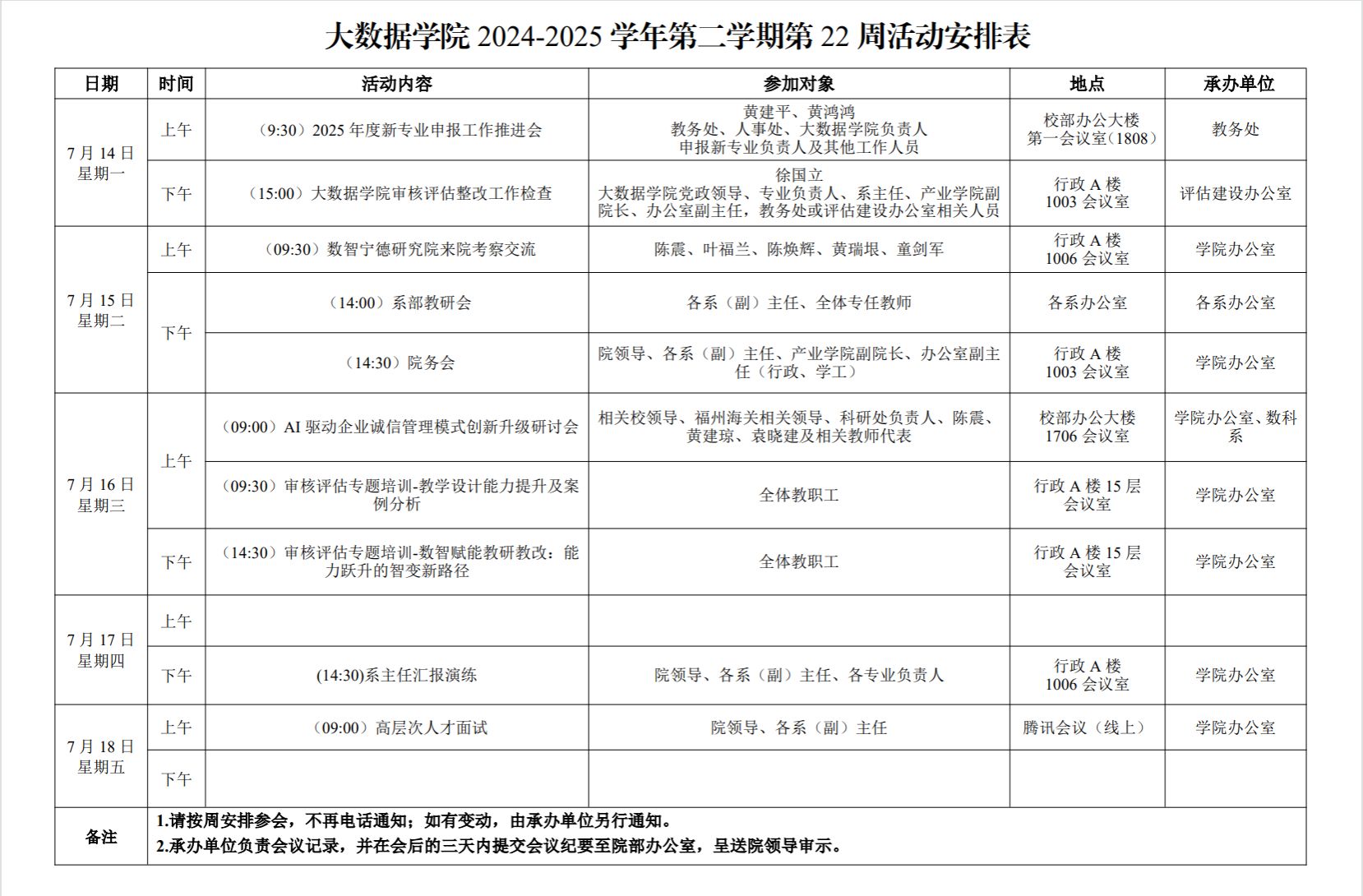 大数据学院2024-2025学年第二学期第22周活动安排表