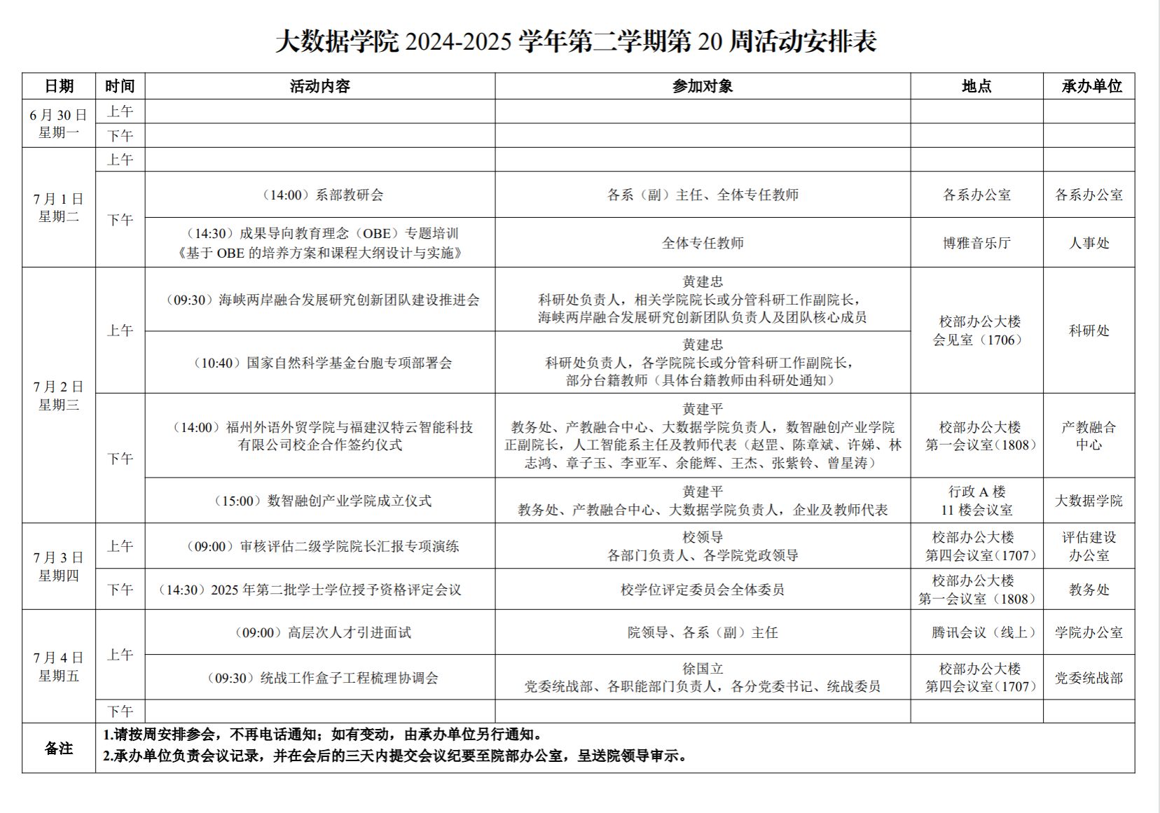 大数据学院2024-2025学年第二学期第20周活动安排表