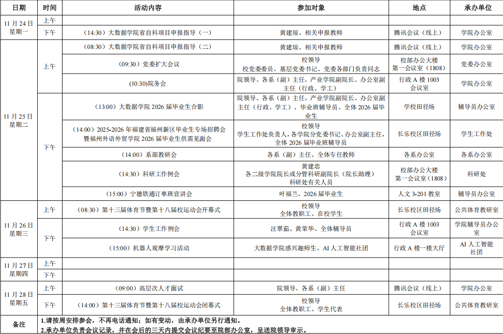 大数据学院 2025-2026 学年第一学期第 13 周活动安排表