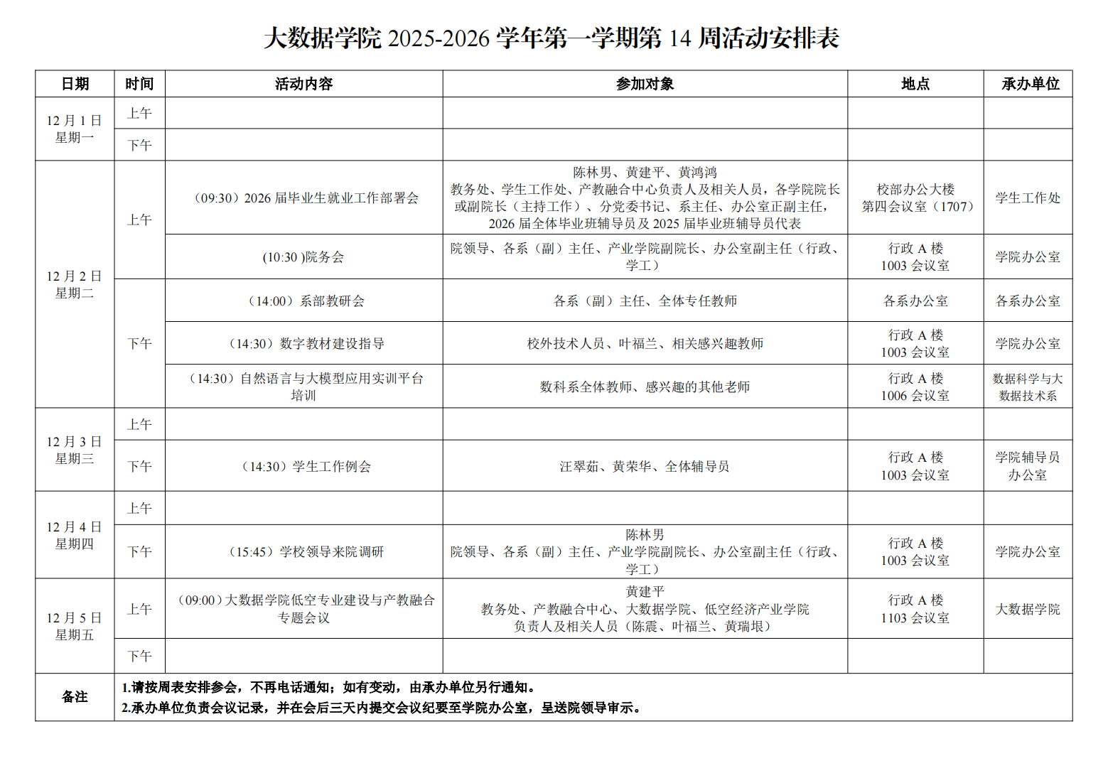大数据学院2025-2026学年第一学期第14周活动安排表
