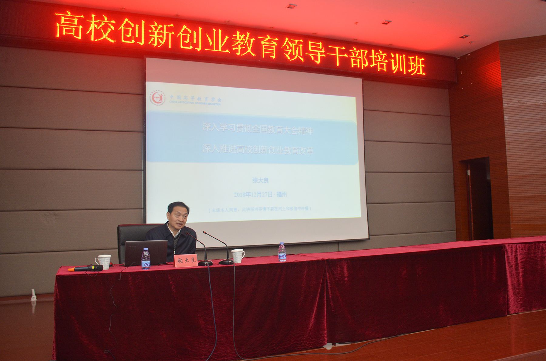 开班仪式后,中国高等教育学会副会长,教育部高等教育司原司长张大良为培训学员们做了第一个专题报告。张大良以《深入学习贯彻全国教育大会精神深入推进高校创新创业教育改革》为题,结合全国教育大会上习近平总书记的重要讲话精神,从怎么培养人、为谁培养人、培养什么样的人等多方面进行了深入阐释。张大良的报告十分精彩,高屋建瓴、内容丰富、深入浅出,深刻回答了为谁办大学、办什么样的大学、如何办大学的根本性问题。