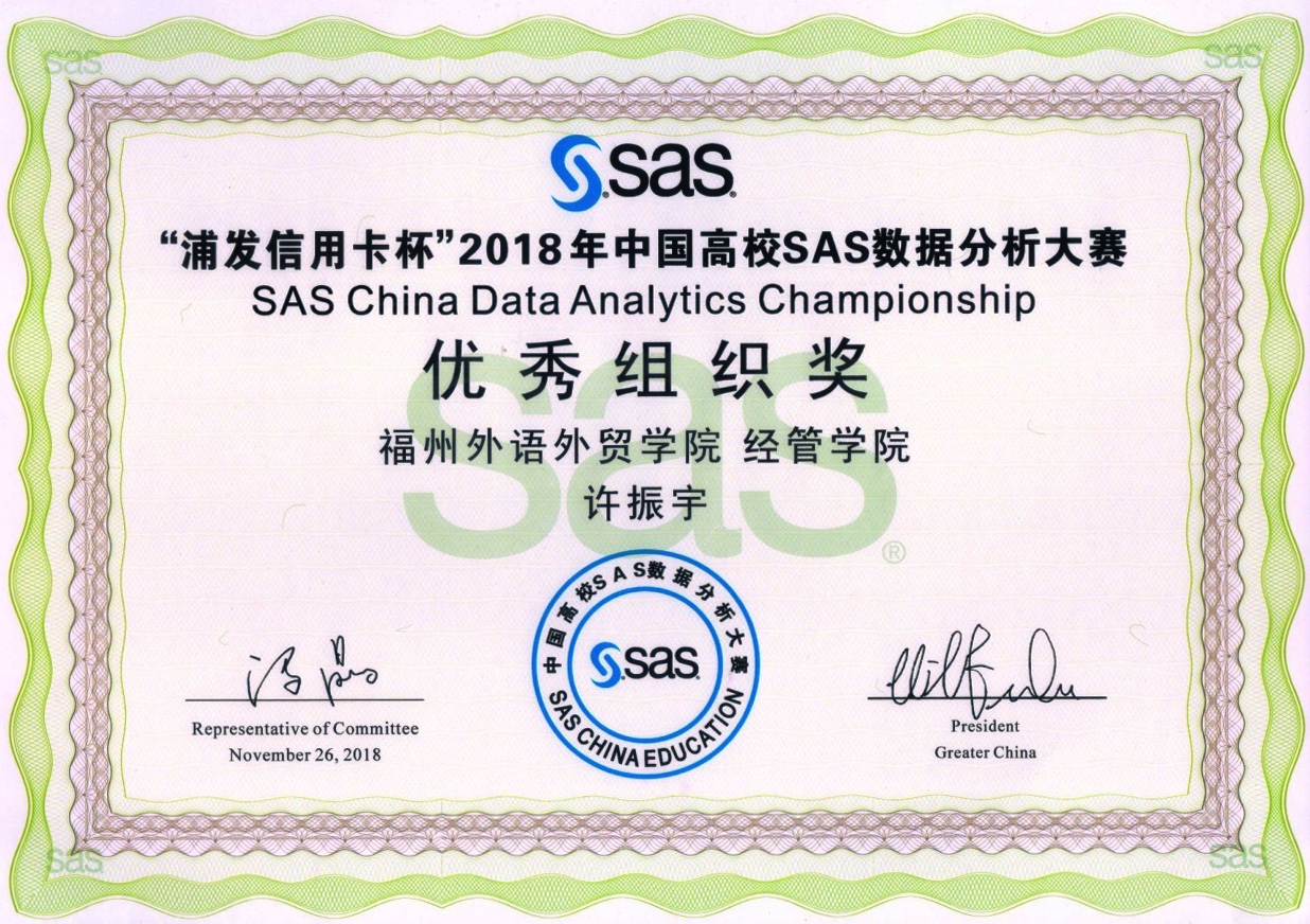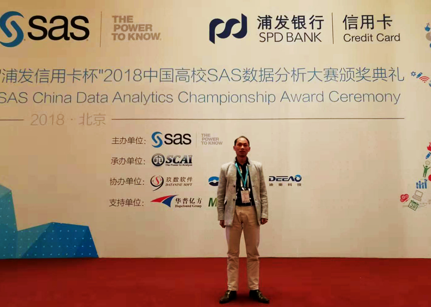 11月26日下午,由SAS中国举办的“浦发信用卡杯”2018年中国高校SAS数据分析大赛决赛颁奖典礼在北京钓鱼台国宾馆举行,我校经管学院学生林伟、王欣、李政宝(指导老师:许振宇、高春姣、魏妹金)与北京大学、清华大学、复旦大学等国内一流高校参赛学生同台竞技,挺进全国百强。经管学院经济统计学系主任许振宇获优秀组织奖。