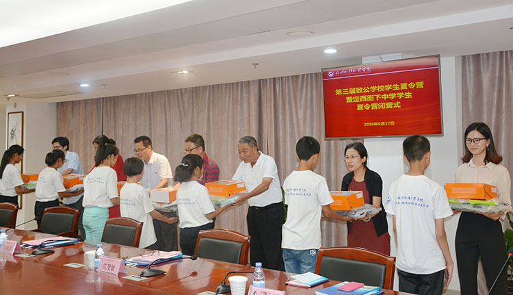 在闭营式上,大家一同观看了《乐鱼网页版2018年致公学校学生夏令营掠影》短片,回味充实丰富的夏令营时光。最后,我校向夏令营全体学生们赠送了书包、运动鞋、运动装等礼品,并祝福他们开启人生新征程。