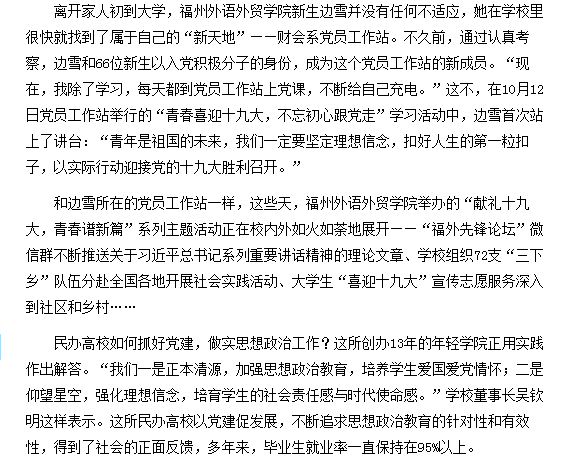 10月15日,光明日报“迎接党的十九大特刊”刊发通讯《民办高校党建热》,大篇幅报道我校党的建设和思想政治教育工作成效。