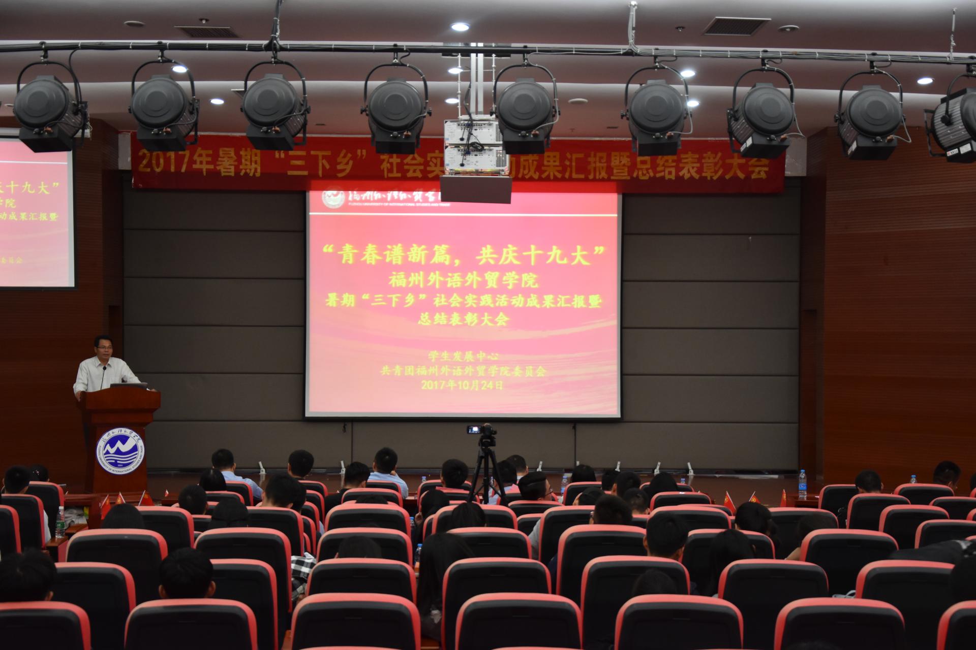 陈炳钦在会上讲了话。他指出,听了“优秀实践团队”的成果汇报深受教育。同学们将社会实践中所思、所闻、所见、所想汇成五分钟的精彩课件和视屏,让与会师生如身临其境,同样接受了一次深刻的教育;同时也深受鼓舞。同学们牢记总书记教诲,深入基层,情系父老乡亲,用所学的专业知识和技能服务父老乡亲。今年暑期“三下乡”社会实践活动聚焦精准、内容丰富、宣传到位、组织精密、效果显著,充分展示了福外学子良好的综合素质和强烈的社会担当,引起社会和媒体的广泛关注,得到团中央和团省委充分肯定。本次实践活动中,学发中心、学工部、校团委、马克思主义学院和所有辅导员(素质教师)分工负责,齐心协力,有效指导,成果丰硕。他代表校党政领导向参与暑期“三下乡”社会实践活动的各职能部门负责人、基层团干、指导老师和广大青年学生表示诚挚的问候和热烈的祝贺。他强调,值此全党全国各族人民欢庆党的十九大胜利闭幕,兴起学习党的十九大报告热潮的喜庆日子里,希望全体师生坚持以习近平新时代中国特色社会主义思想为指导,深入学习领会和认真贯彻执行习近平总书记在党的十九大的报告和党的十九大精神,紧密团结在以习近平同志为核心的党中央周围,坚定不移跟党走;牢固树立共产主义远大理想和中国特色社会主义共同理想,培育和践行社会主义核心价值观;发奋学习,立志全面发展,把自己培养成为德智体美全面发展的中国特色社会主义合格建设者和可靠接班人,为建设富强民主文明和谐美丽的社会主义现代化强国贡献自己的力量。