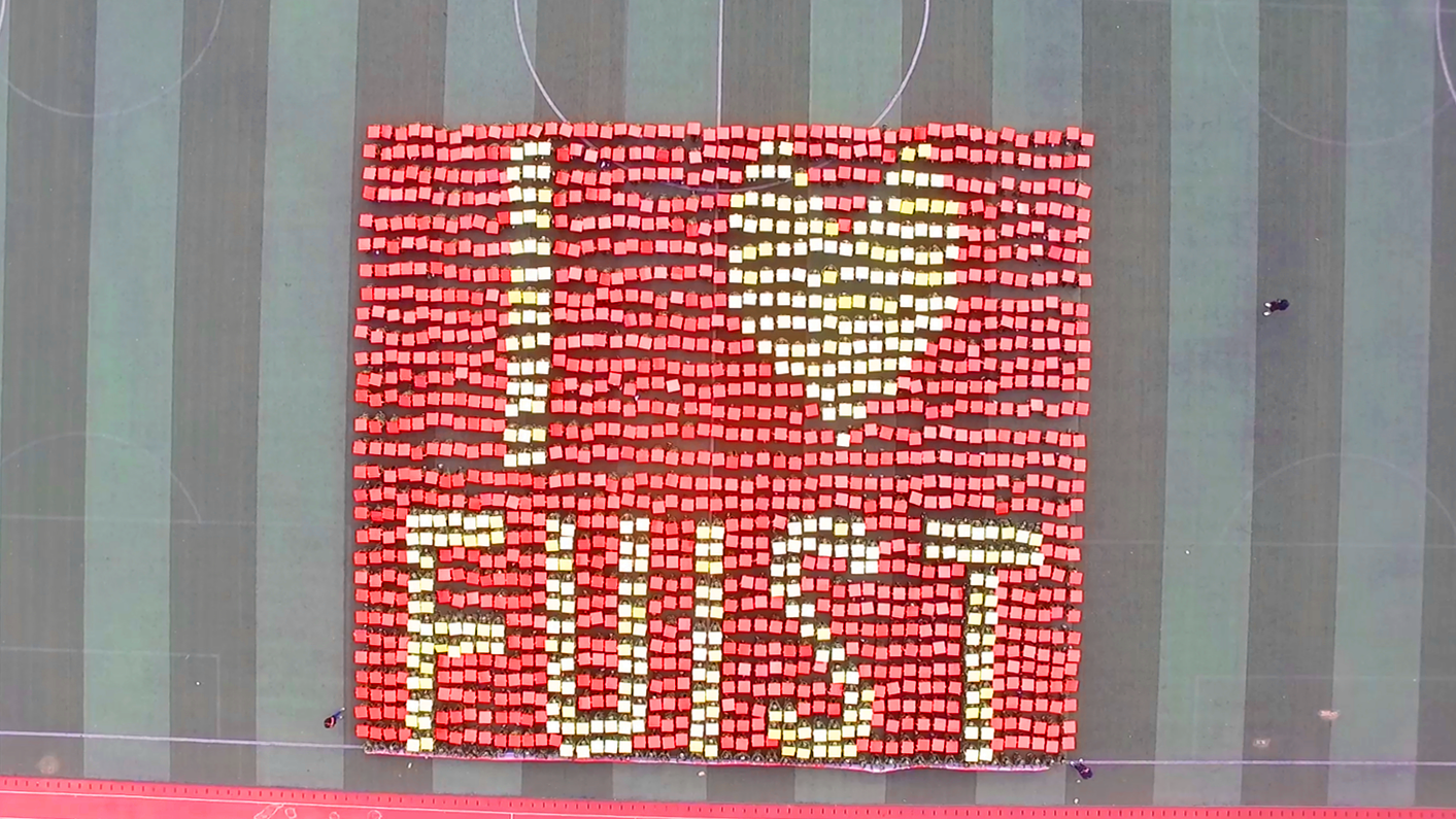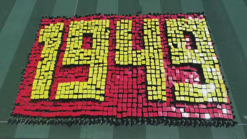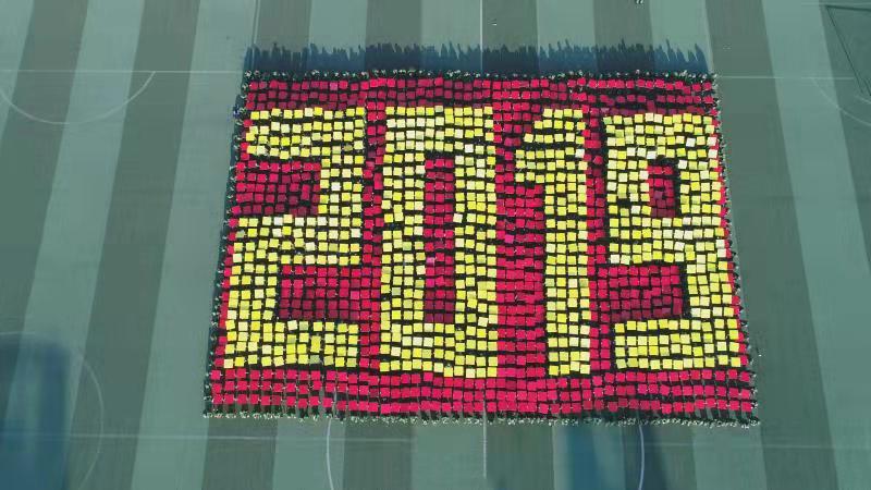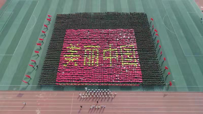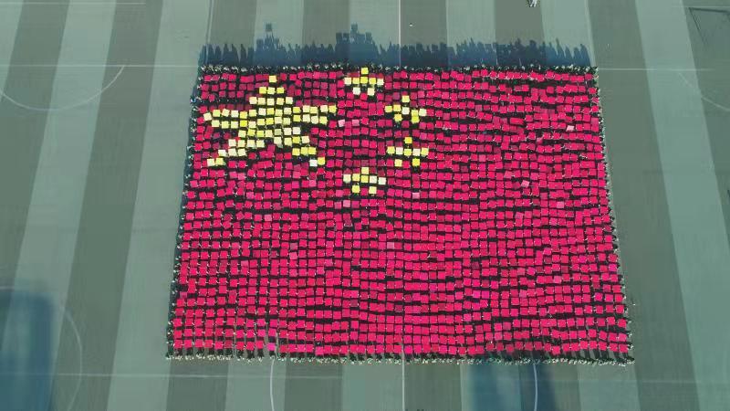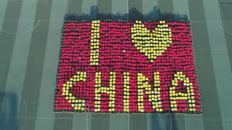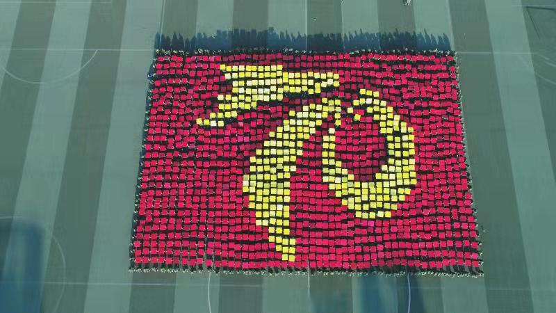 “美丽中国”“I❤CHINA”“I❤FUIST”、校训“融会中外 经世致用”以及五星红旗图案。现场4000余名师生齐唱《歌唱祖国》和《我和我的祖国》,表达福外人热忱的爱国情怀,献礼新中国成立70周年。