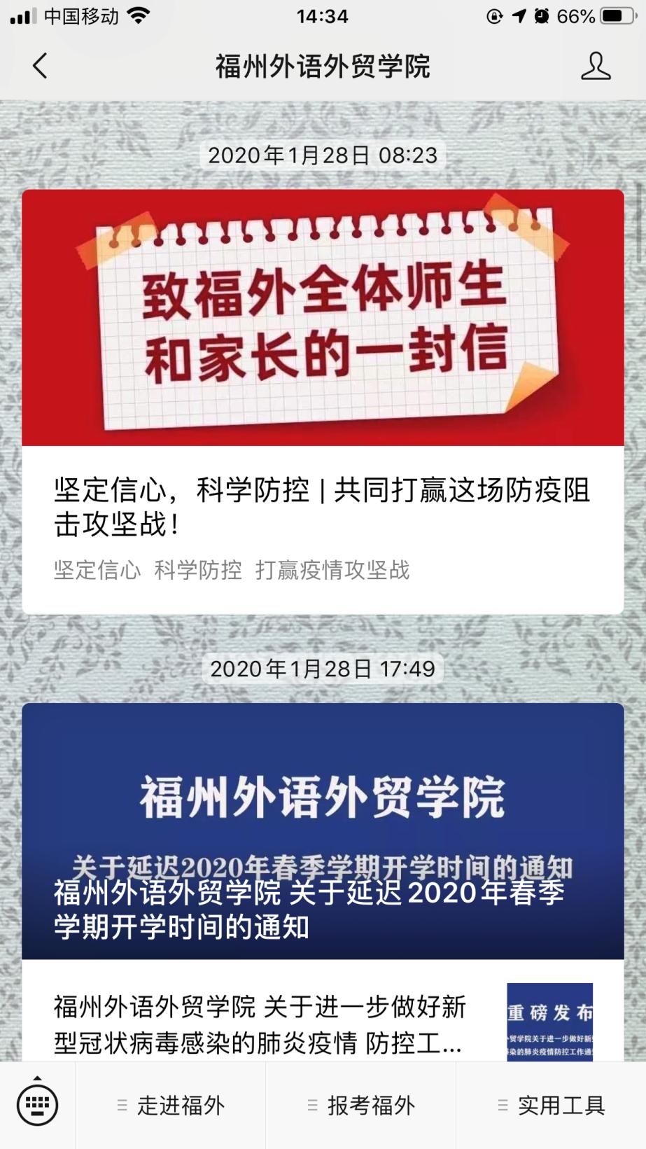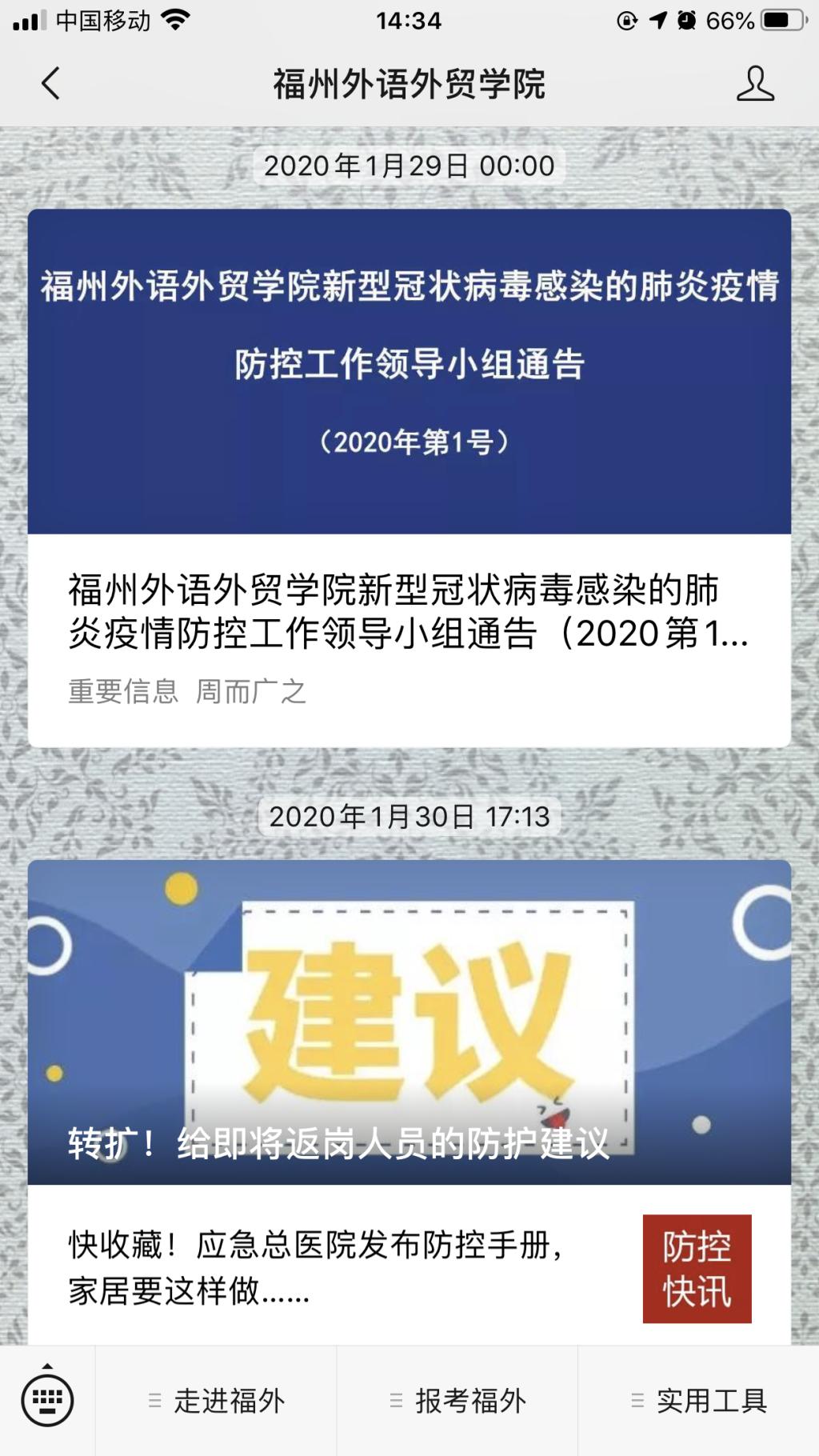 全员覆盖,紧抓狠抓宣传教育。针对寒假期间师生已经返乡的实际情况,学校充分发挥公众号、微信群、QQ群、校园网等网络渠道作用。微信公众号连续发布《中共福建省委教育工作委员会、福建省教育厅致福建省全体师生和家长的一封信》《福州市致全市市民的一封信》,学校《致全体师生和家长的一封信》《致福外湖北籍师生的一封信》《致我校外籍师生的一封信》,校友会《致广大福外人的一封信》,校团委《致全体学生党员、学生干部的一封信》,动员全体师生、校友、家长特别是我校湖北籍师生增强自我防护意识,配合当地政府和学校做好有关防控工作。向各支部和全体党员发送《福建省委组织部致全省各级党组织和广大党员的一封信》,要求支部发挥战斗堡垒作用,全体师生党员充分发挥先锋模范作用,主动投身疫情防控各项工作,在工作中带好头、做好表率。学校各级各类QQ群、微信群及时转发各级教育主管部门和疾控部门制定的防控知识手册、疾病防范须知等,普及防控知识。制定《新型冠状病毒感染肺炎防控信息》,结合福州市教育局制定的《防控新型冠状病毒感染的肺炎科普知识(告家长书)》,通过微信、短信等形式向每位师生点对点逐一进行发送,宣传教育实现师生群体100%全覆盖。