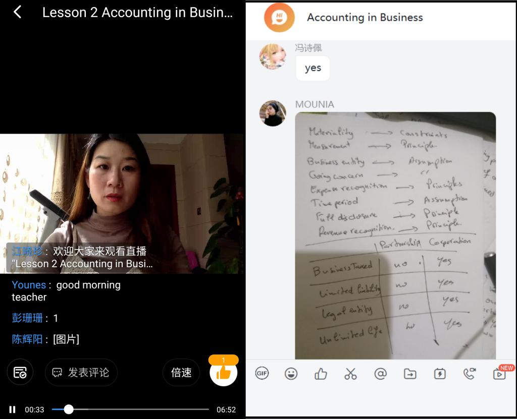 《Accounting in Business》江晓珍老师:对国际学生来说,刚开始接触线上学习时遇到了不少困难,一是慕课认证账号的问题和容易进错了课程,而且有些同学没有电脑,可是有几个作业要在电脑上做才能提交;二是“U校园”不能用越南手机号注册。现在在老师同学的帮助下所有问题都已经解决了,我认为超星学习通上课非常方便,使用简单,可以签到,看视频,任务表很明显,老师可以发布PPT或者资料。因为这是我们第一次在网络上课,遇到困难也很正常,但是网络学习也有优点,是一次全新的体验,比如我们不懂的地方可以反复回放学习,方便我们弄懂知识点,我还可以通过网络认识不同专业的中国同学。我们希望中国战胜疫情,大家能早日返回校园,我很想念福外。感谢学校和老师们为我们提供在线学习的机会,我们一定努力学习,不错过每次课程。
