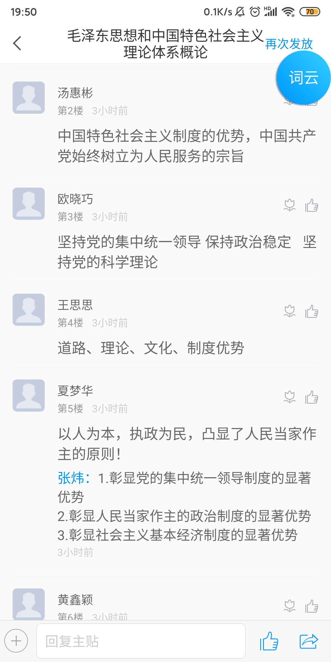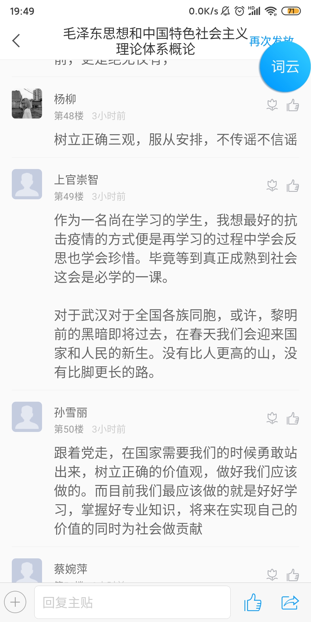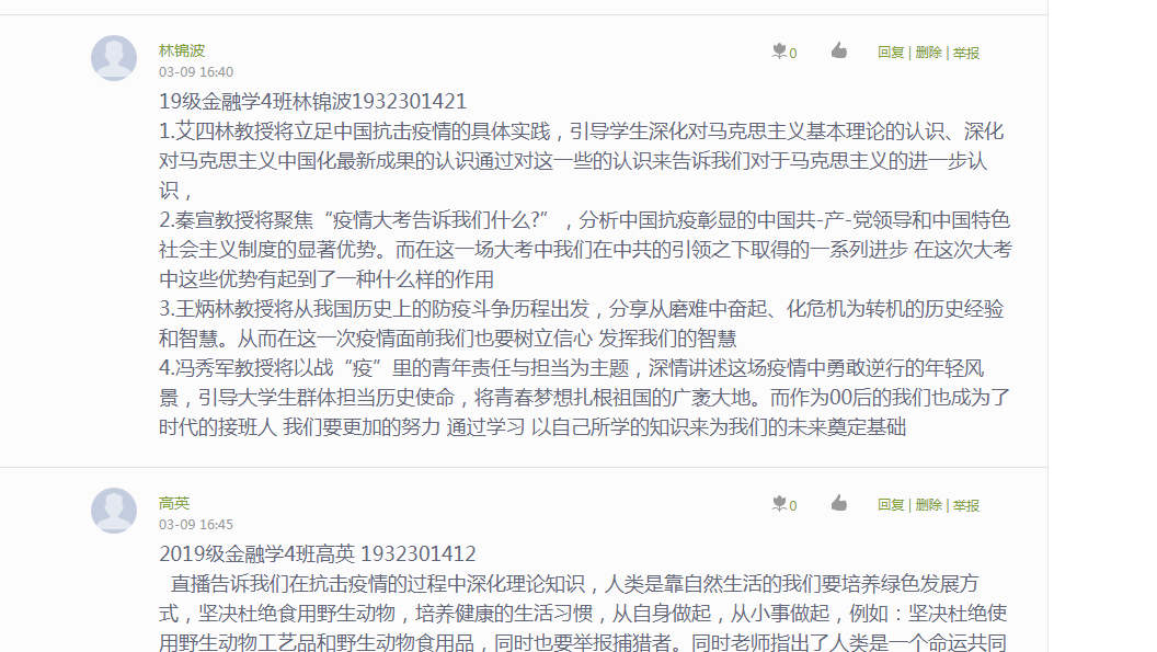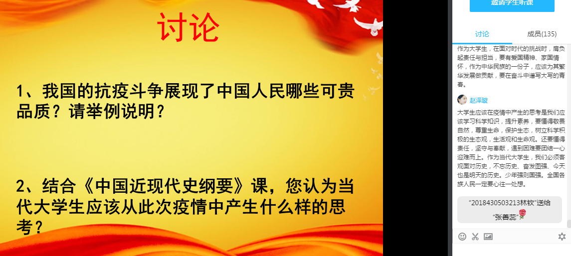 直播课程后,马克思主义学院思政课教师结合思政课程教学,组织同学们开展在线交流讨论,同学们反响热烈。财金学院吴佳丽同学表示,通过这堂思政课,深刻地认识到中国特色社会主义制度的优越性,并更加坚信中国共产党会带领人民控制疫情,中国人民众志成城的信念以及敢于逆行的勇气会战胜一切困难。艺术与设计学院陈永辉表示,同学们在疫情期间要服从教育部门和学校安排,不提前返校,科学规划学业,通过网络教学跟上课业进度,真正做到“停课不停学”。经管学院胡子炫同学表示,身为校团委青年志愿者协会一员,应该勇于担当,主动投身志愿服务,努力为疫情防控贡献自己的一点力量。