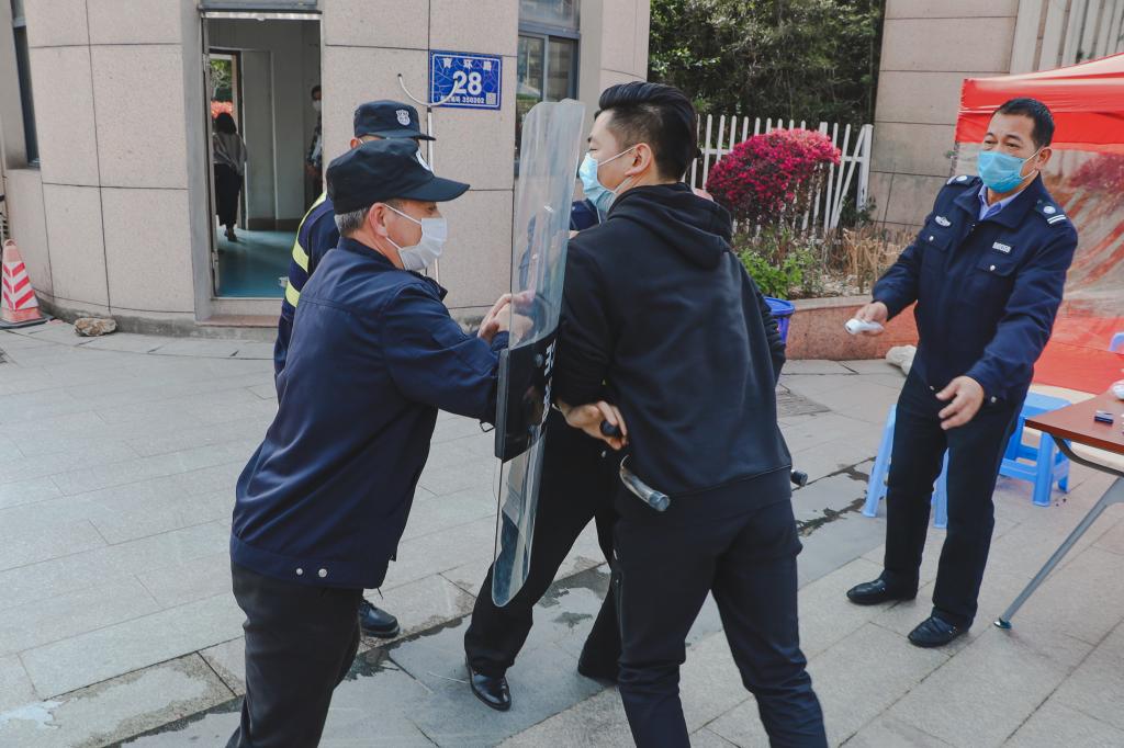 开学后师生错峰入校体温检测异常场景和开学后外来人员入校不配合学校体温检测工作场景模拟演练在校门口进行,40余位参演人员分别承担学生、工作人员等角色演练任务,工作人员首先对场地进行消杀,接着逐项演练了师生返校、外来人员入校等涉及的排队引导、身份核验、消毒测温、信息登记等环节的工作流程,并着重演练了出现学生发热等身体异常症状、外来人员不配合学校体温检测工作的应急处置,全过程各工作组演练目标明确、任务分工清晰,协同配合高效,切合工作实际。