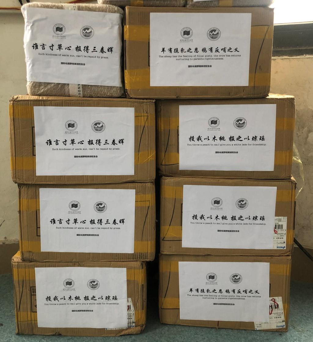 3月29日,我校2017届、2018届、2019届精英班校友共同向母校捐赠一批抗疫物资,包括一次性防护口罩2020个,防护手套1000个,消毒酒精75桶150升。