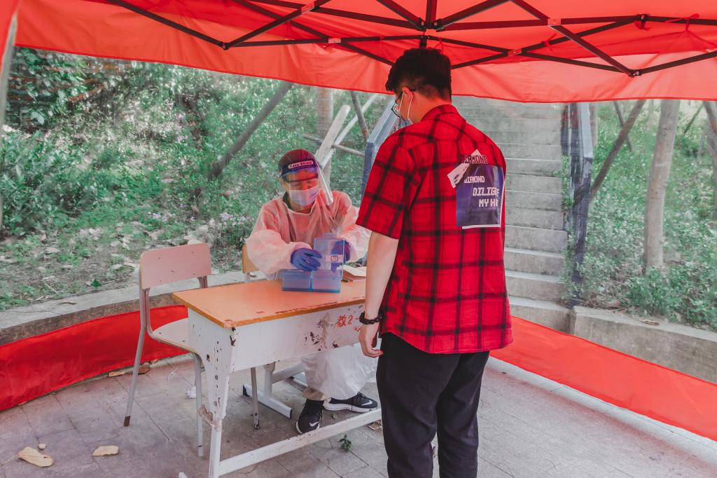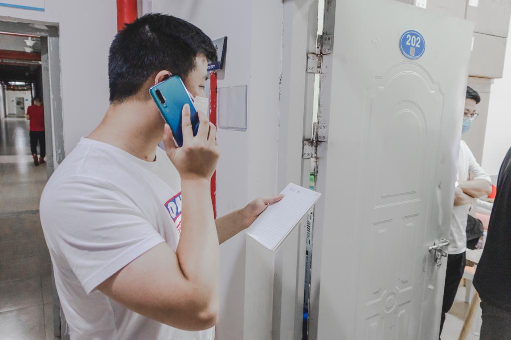 学生宿舍内晨检过程中发现学生体温异常演练在北区学生宿舍进行。参演人员饰演的学生干部在学生宿舍例行每日晨检,过程中发现1名体温出现异常情况的学生,立即报告辅导员。辅导员将发热学生带到宿舍区临时隔离点,并报告学校疫情防控领导小组办公室。学校疫情防控领导小组办公室立即安排医务室值班医生前往宿舍区临时隔离点,使用水银体温计对发热学生进行体温复测,并进行个人信息登记。
