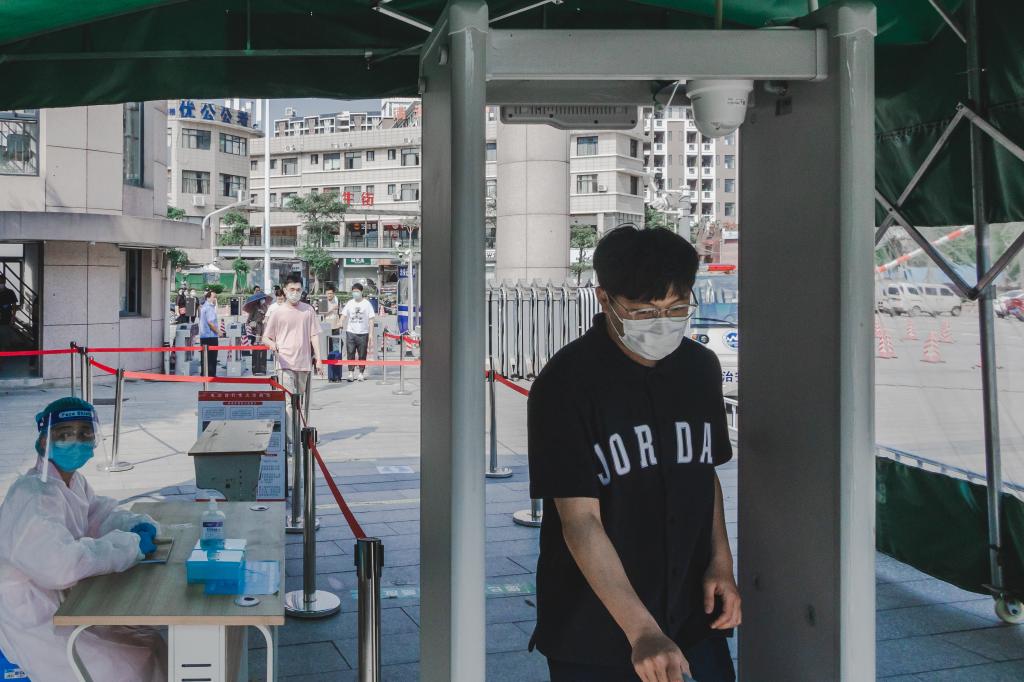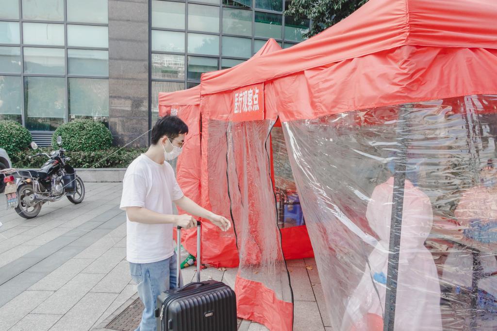 学生入校体温检测异常演练在校门口进行。安保中心工作人员引导由参演人员饰演的返校学生进入体温检测通道,体温检测过程中发现1名体温异常学生。现场值守医务人员将发热学生带至临时隔离场所帐篷内,进行临时隔离观察。校医务人员使用水银体温计对发热学生进行体温复测,并对发热学生进行身份核验登记。
