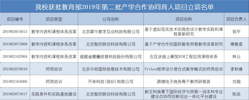近日,教育部公布2019年第二批产学合作协同育人项目立项名单,我校6个项目获批为2019年第二批产学合作协同育人项目立项。