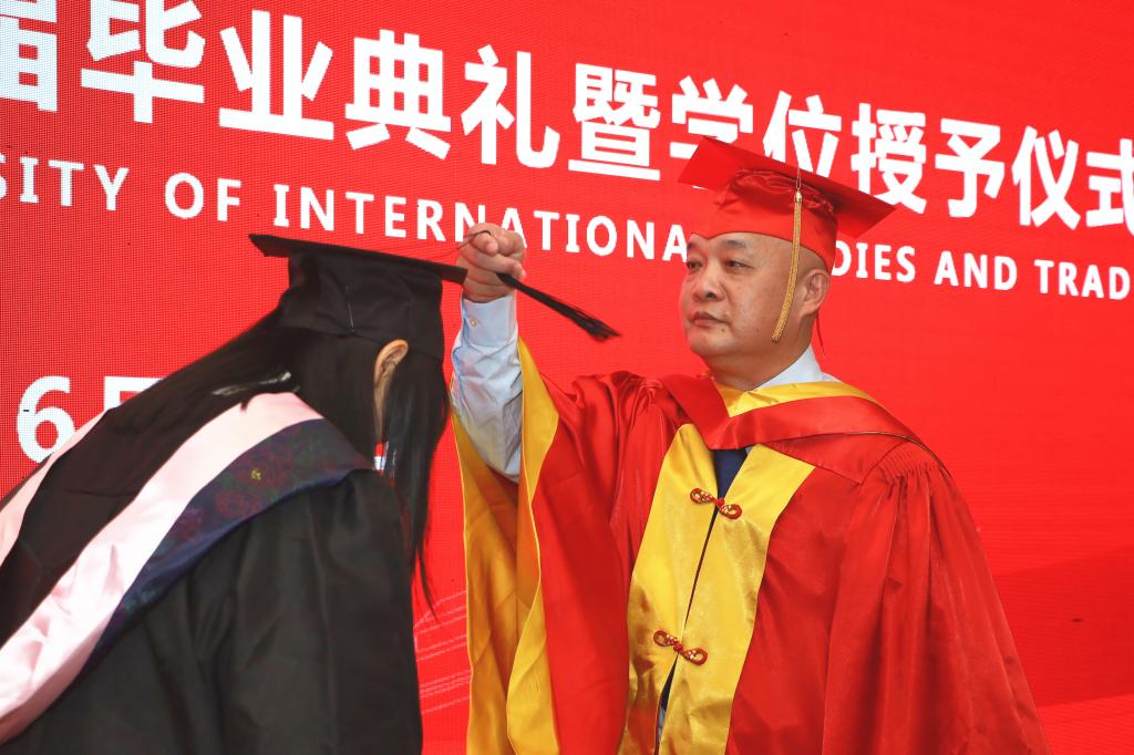 校学位评定委员会副主席、执行校长黄建平教授宣读《准予2020届毕业生毕业的决定》和《授予2020届毕业生学士学位的决定》。4187名毕业生圆满完成学业,肩负“融会中外 经世致用”的校训,踏上新征程。