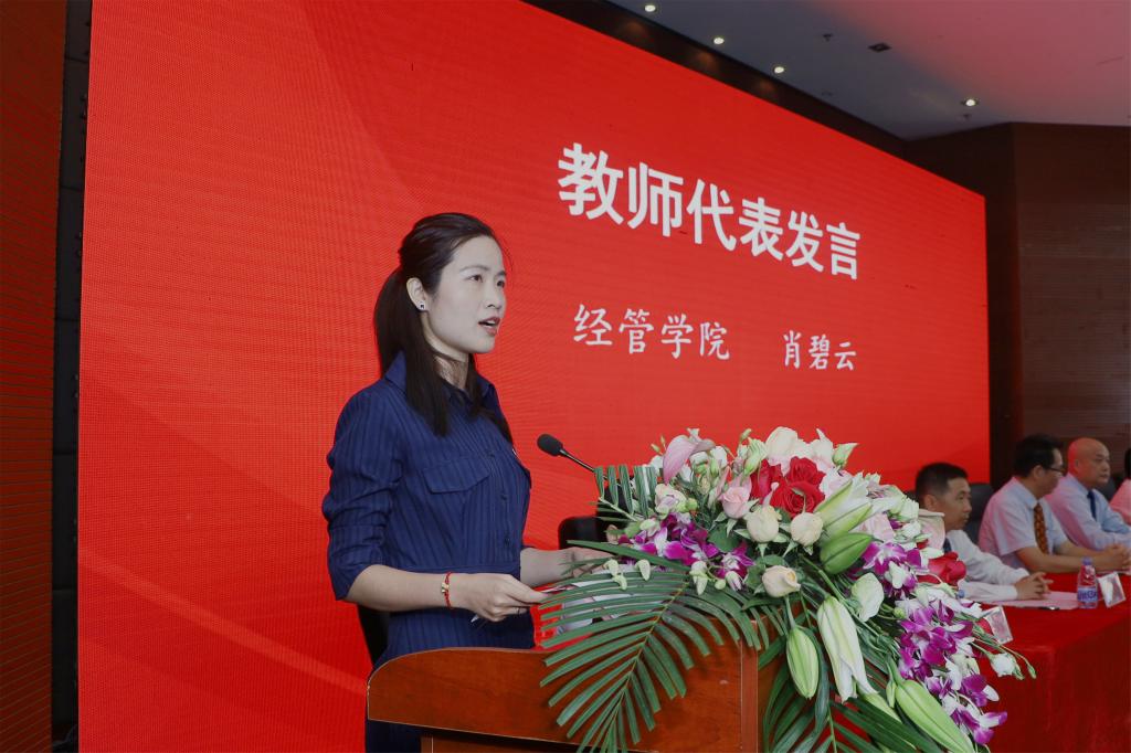 经管学院肖碧云老师作为教师代表发言,向2020届毕业生顺利毕业表示热烈祝贺,她希望毕业生们能胸怀天下,脚踏实地,奉献社会,无论在什么样的岗位,都要时刻不忘继续学习,不要放弃曾经的梦想。
