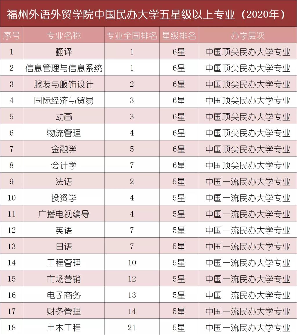 近日,艾瑞深中国校友会网最新发布《2020中国民办大学一流专业排名》,我校位列全国民办大学第16位,福建省首位。其中,翻译、信息管理与信息系统、服装与服饰设计、国际经济与贸易、动画、物流管理、金融学、会计学等8个专业荣膺2020中国六星级专业,跻身中国顶尖民办大学专业行列;法语、投资学、广播电视编导、英语、日语、工程管理、市场营销、电子商务、财务管理、土木工程等10个专业荣膺五星级专业,跻身中国一流民办大学专业行列;另有6个专业荣膺四星级专业,2个专业荣膺三星级专业。