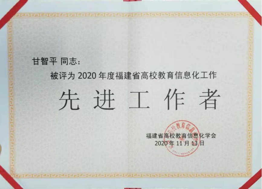 11月11日至13日,“福建省高校教育信息化学会2020年高校教育信息化工作研讨会”在南平建阳召开。大会表彰了2020年度福建省高校教育信息化工作“先进单位”和“先进工作者”。我校荣获“2020年度福建省高校教育信息化工作先进单位”,教学资源中心副主任甘智平荣获“2020年度福建省高校教育信息化工作先进工作者”。