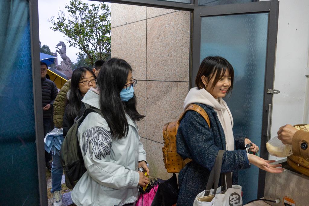 只见下班准备回家的教职工们正有序地领取由学校免费供应的“暖冬点心”。手捧着温暖精致的点心,教职工们的脸上露出幸福的笑容。
