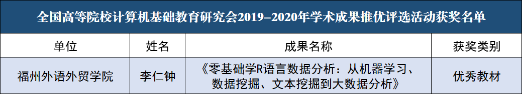 日前,在全国高等院校计算机基础教育研究会2019-2020年学术成果推优评选活动中,我校理工学院副院长李仁钟教授编写的教材《零基础学R语言数据分析:从机器学习、数据挖掘、文本挖掘到大数据分析》荣获“优秀教材”。