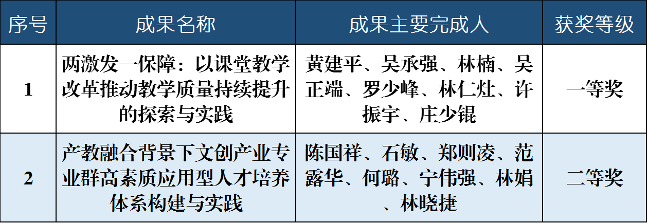 近日,福建省教育厅发布《关于公布2020年高等教育省级教学成果奖获奖项目的通知》(闽教高〔2020〕24号),我校黄建平教授主持的《两激发一保障:以课堂教学改革推动教学质量持续提升的探索与实践》荣获2020年福建省高等教育教学成果奖一等奖,陈国祥教授主持的《产教融合背景下文创产业专业群高素质应用型人才培养体系构建与实践》荣获二等奖。