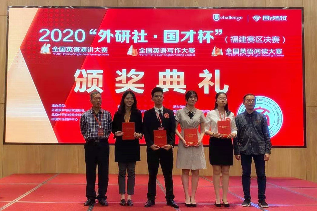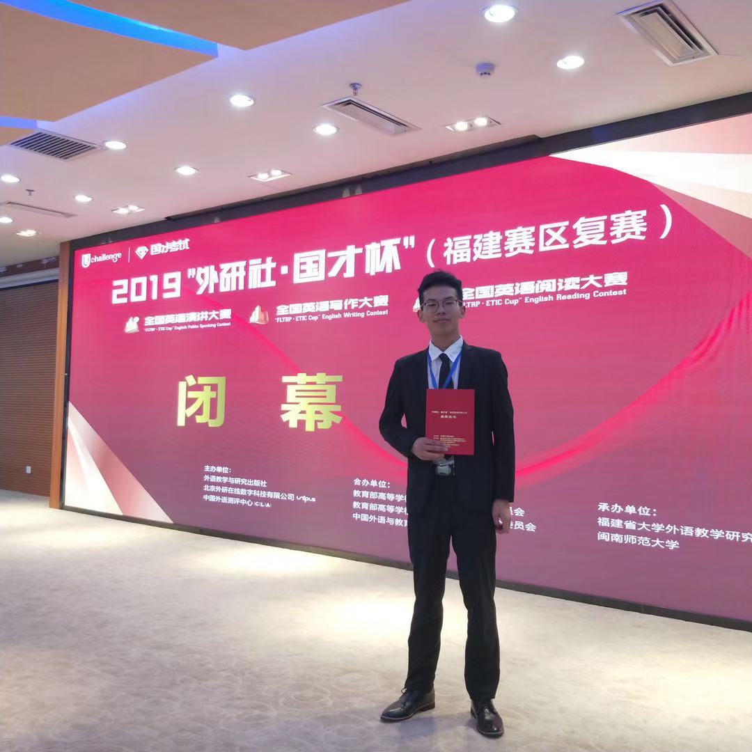 2019-2020学年获“外研社-国才杯全国英语演讲大赛”福建赛区一等奖,“海峡两岸大学生英语口语演讲比赛”一等奖;2020-2021学年获“外研社-国才杯全国英语演讲大赛”福建赛区决赛特等奖、全国三等奖。