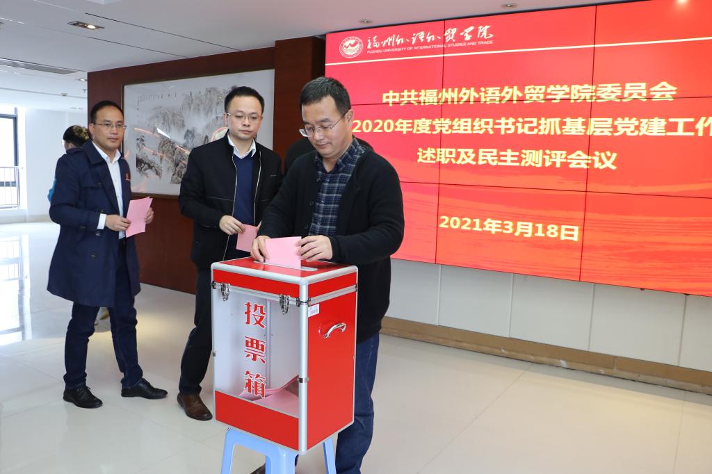 3月18日,我校召开2020年度党组织书记抓基层党建工作述职及民主测评会议,党委书记陈炳钦,校党委委员,分党委、直属支部书记,党委工作部门负责同志,师生代表等参加会议。