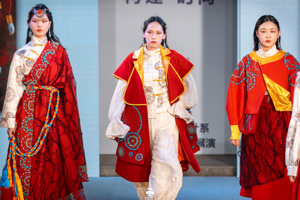 伴随着绚丽的灯光秀,服装与服饰设计系毕业展演拉开序幕,本次展演围绕“潮流起航”“未来永续”“传承创新”“再建时尚”四个主题,共展出25组125套服装作品。