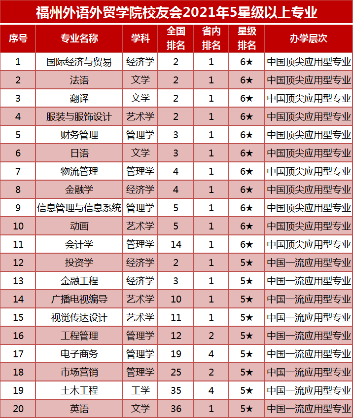日前,艾瑞深中国校友会网最新发布2021校友会中国一流专业排名、2021福建省一流专业排名和2021福建省各学科门类一流专业排名。我校在全国财经类大学一流专业排名(应用型)中位列第9名,在福建省应用型高校一流专业排名中位列第4名,居福建省民办大学首位。其中,国际经济与贸易、法语、翻译、服装与服饰设计、财务管理、日语、物流管理、金融学、信息管理与信息系统、动画、会计学等11个专业入选6星级中国顶尖应用型专业,投资学、金融工程、广播电视编导、视觉传达设计、工程管理、电子商务、市场营销、土木工程、英语等9个专业入选5星级中国一流应用型专业。另有7个专业入选4星级专业,6个专业入选3星级专业。