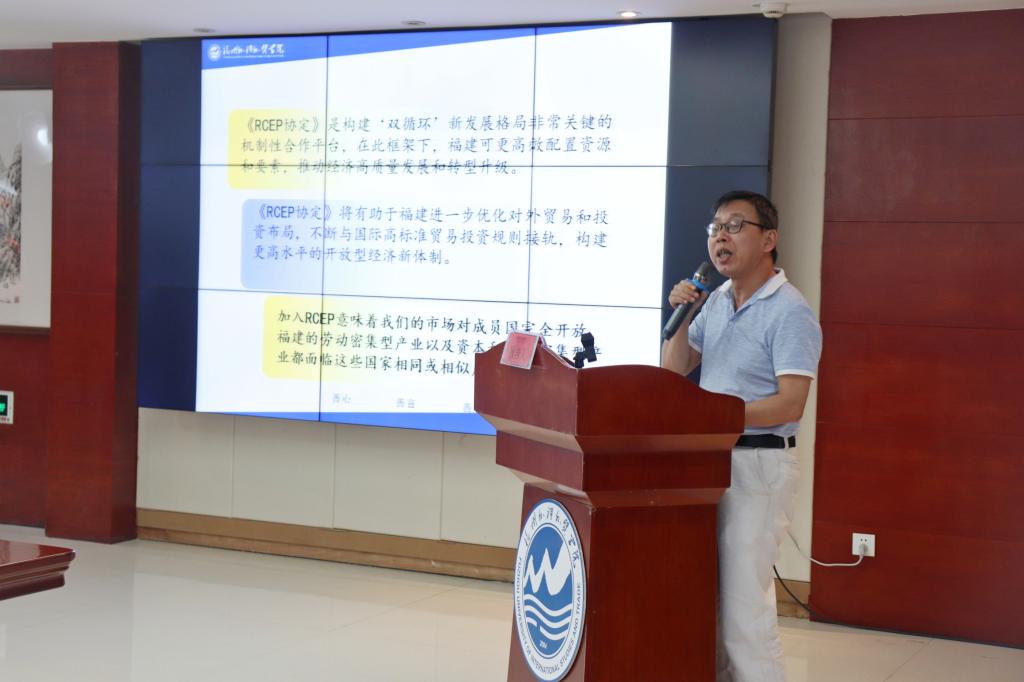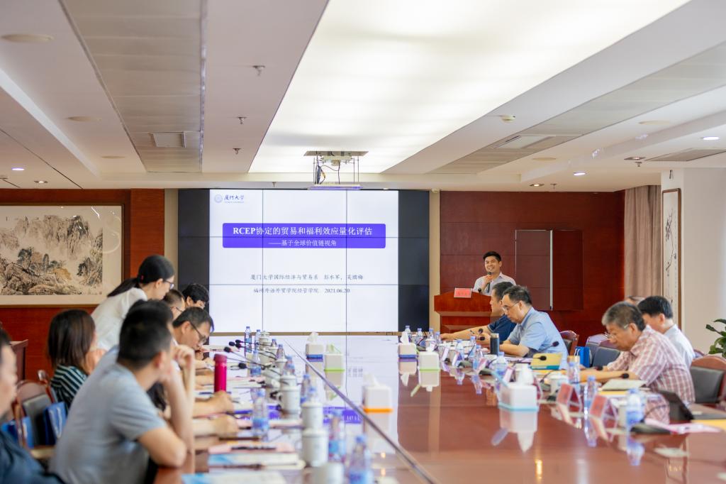 当日上午还举行了“RCEP 协定生效对福建省的经济效应(机遇与挑战)”主题研讨会。彭水军教授作题为“RCEP 协定的贸易与福利效应量化评估——基于全球价值链视角”的主旨演讲。陈忠教授作题为“RCEP 服务贸易与投资背景下福建外贸发展对策思考”的主旨演讲。