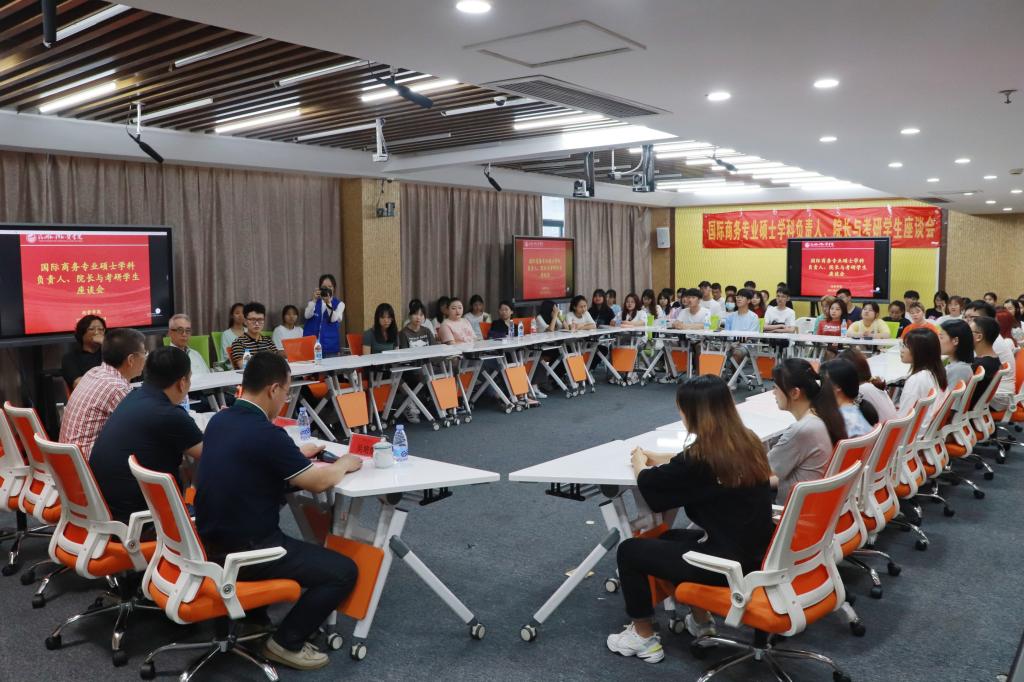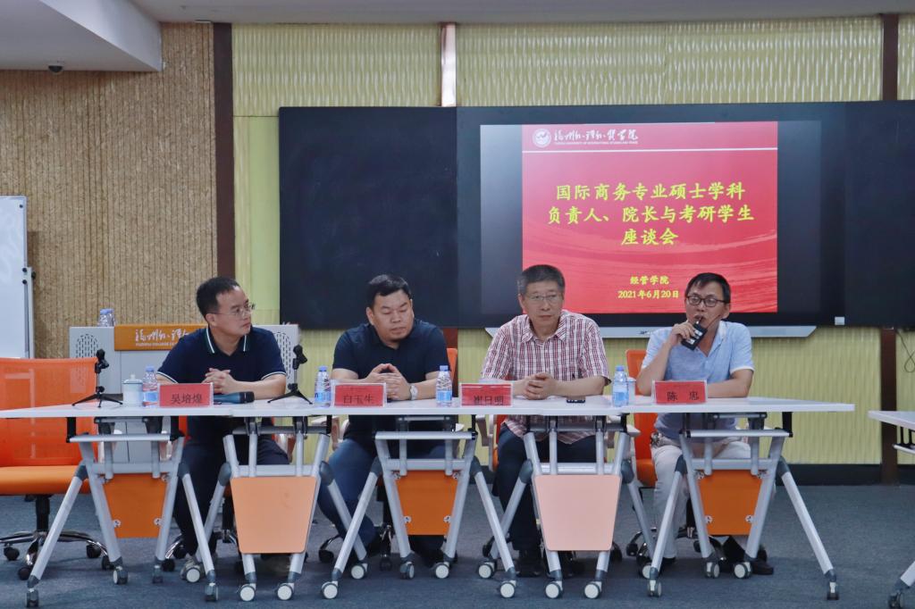 下午还举行了国际商务专业硕士(MIB)学科负责人、院长与考研学生座谈会。崔日明教授、陈忠教授、白玉生先生与考研学生座谈交流。崔教授为学生介绍了MIB的考研动态,从考研心态、备考方法、报考技巧等方面为考生提供了宝贵的建议,为学院考研工作指明了方向。陈教授要求学生要注重真抓实干,要在总结已有经验的基础上,进一步找准自我定位,并希望考研学生根据备考时间节点,制定科学的考研规划。白玉生通过介绍1+X专业技能等级证书制度,建议学生考研一定要践行习近平总书记提出的“不求最大,但求最优,但求适应社会需要”的人才培养理念,更好地契合专业硕士人才培养的目标。