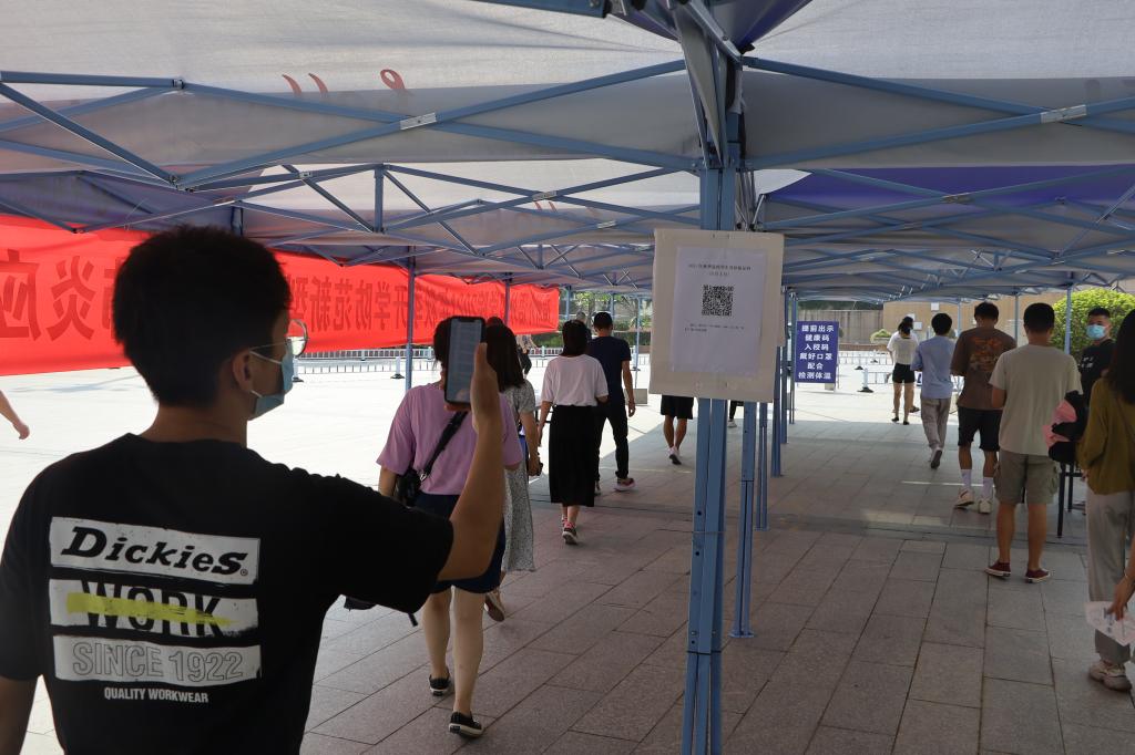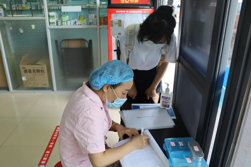 学生入校体温检测异常模拟场景在校门口进行,返校学生在工作人员的引导下有序排队,并保持安全距离,依次完成扫码核验、消毒测温、人脸识别等流程,并着重演练了返校人员体温异常情况处置,现场值守工作人员引导体温异常学生进入临时观察点进行体温复测,经水银体温计复测确认该生体温正常。