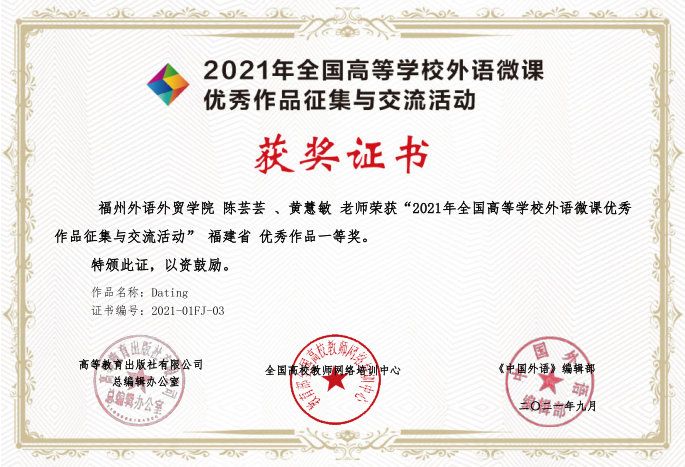 日前,2021年全国高等学校外语微课优秀作品征集与交流活动公布获奖名单。福建省共决出一等奖3项、二等奖4项、三等奖6项。我校外国语学院教师共荣获一等奖1项、二等奖2项、三等奖5项,获奖成绩在省内高校中名列前茅。其中,陈芸芸与黄慧敏组成的教师团队荣获福建省一等奖,并取得进入全国交流活动资格。