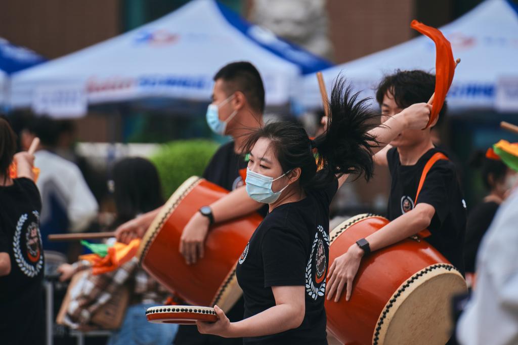 图书馆前的迎新大本营是最热闹的地方,学校的师长都前后奔波,忙碌不停。他们有的高举引导牌、有的帮助新生拿行李、学校太鼓队为欢迎新同学准备了精彩的表演、吉祥物“福小外”也前来助阵......现场热闹非凡。