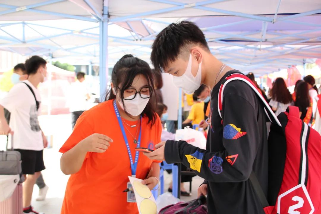 到校的新生陆续搭乘摆渡车前往宿舍区域,此时志愿者们早已等候在宿舍楼下,学长甚至学姐都化身成“大力士”,扛起新生们的行李就上楼。学生党员也活跃在迎新现场,以实际行动践行承诺。