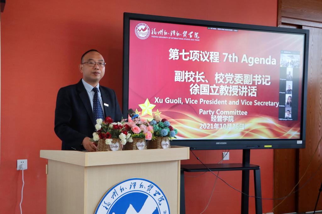 校党委副书记、副校长徐国立代表全校师生向2021级国际学生表示热烈欢迎,他介绍了学校开展国际教育的进程以及全英授课班的办学成效。他希望通过这一教学创新,吸引更多的国际学生了解中国,为两国文化交流做贡献;希望来校学习的国际学生,能够充分利用在中国学习的时间,了解中国,学习中国的文化,思考中国飞速发展的原因,掌握跨文化交流的能力和国际贸易方面的知识和技能,将来为本国经济建设服务。希望培养更多的中国学生走向世界,进一步提升我校的国际化办学水平,进一步体现学校“外+”办学特色,共建创新包容的开放型世界经济,开创人类更加美好的未来。