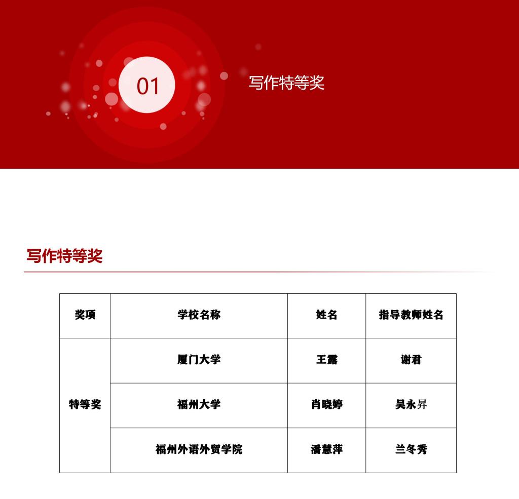 在写作大赛中,2018级英语专业潘慧萍(指导老师:兰冬秀)从全省38所高校169名选手中脱颖而出,与厦门大学、福州大学选手并列荣获福建省特等奖,入围全国总决赛。此外,2018英语专业卢戈梓(指导老师:何君晨)荣获一等奖,2018级英语专业杨昕潼(指导老师:兰冬秀)与2020级法语专业吴栎莹(指导老师:林西锦)皆荣获三等奖。