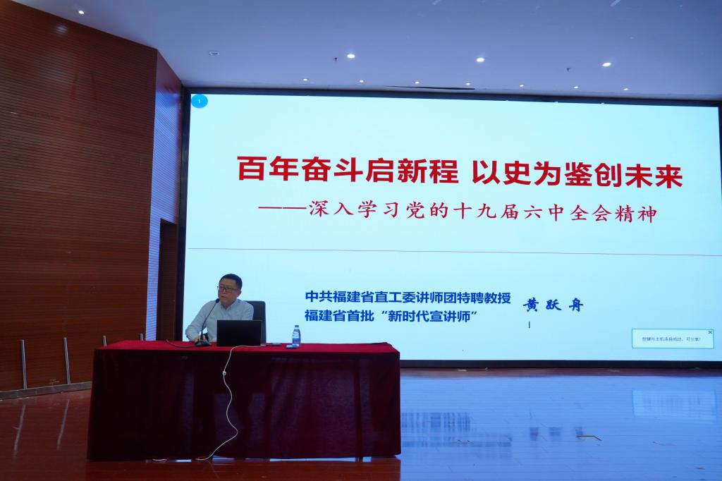会上,校长助理、中共福建省委省直工委讲师团特聘教授、福建省首批“新时代宣讲师”黄跃舟作《百年奋斗启新程 以史为鉴创未来》专题辅导。他结合自身学习体会,围绕“在重要历史关头召开的具有里程碑意义的会议”“准确把握十九届六中全会精神的丰富内涵和核心要义”“从党的百年奋斗史中汲取智慧力量”等三个方面对全会精神进行了深入浅出的讲解。