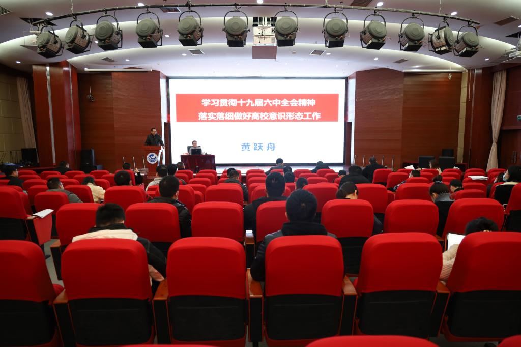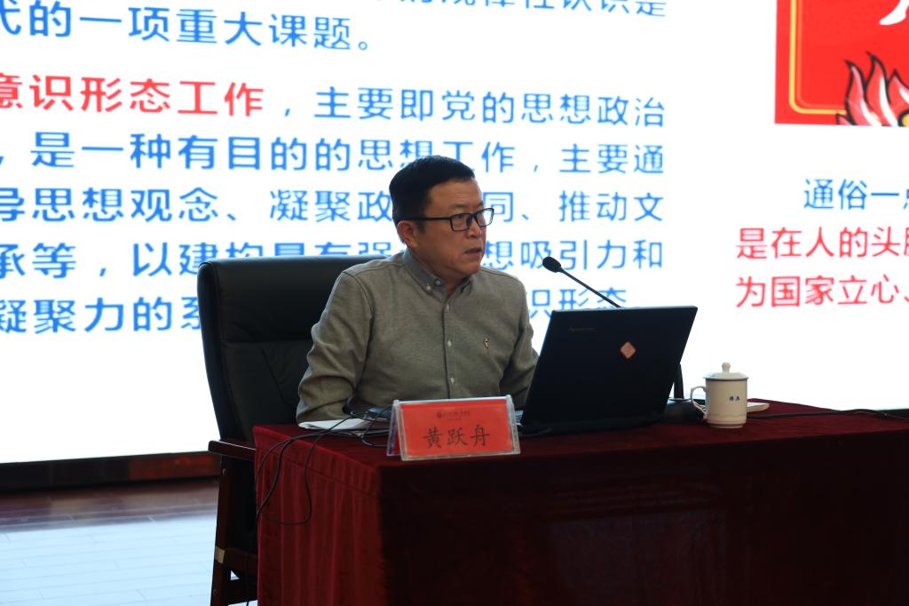 黄跃舟结合自身学习研究的体会,从“深入领会六中全会精神,增强做好新时代意识形态工作的政治自觉、思想自觉、行动自觉”“进入新时代,我国意识形态领域形势已发生全局性、根本性转变”“从‘四个突出’入手,强力推动高校意识形态工作落实落细”等三个方面,对新时代高校做好意识形态工作的重要性、社会背景和实践路径做了深入而具体的阐述。