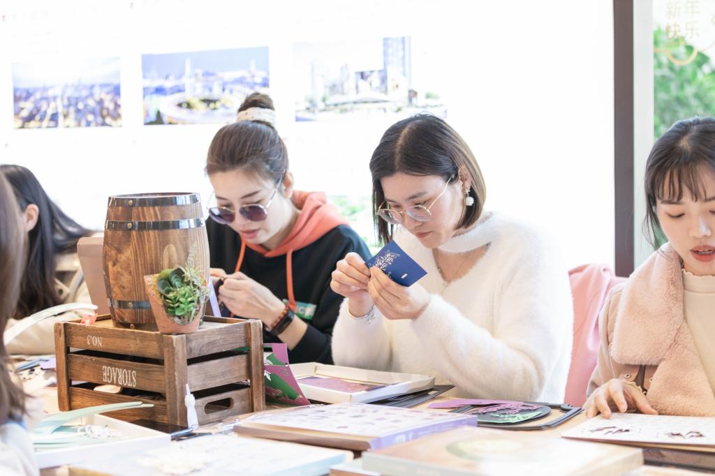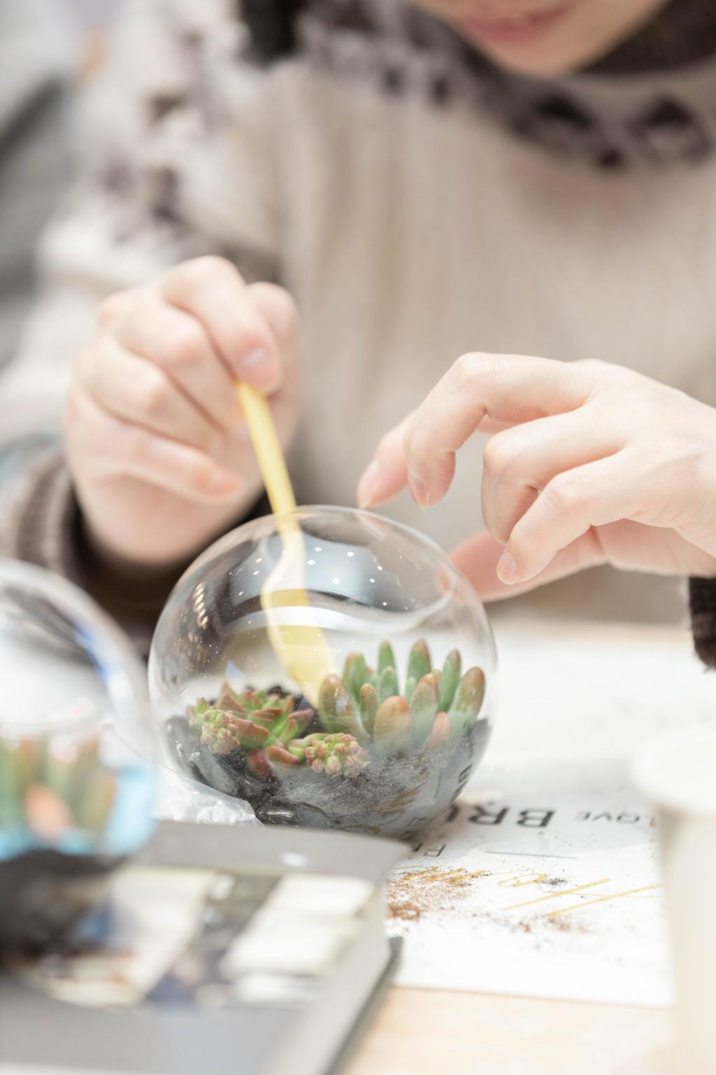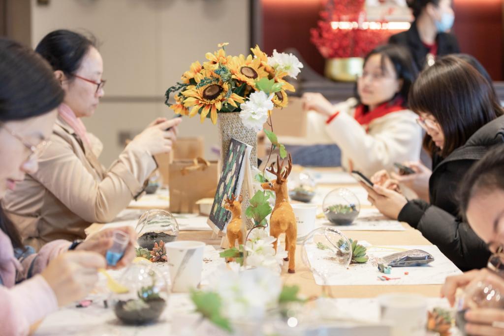 活动现场,大家在花艺师的指导下进行花材修剪,用心体验植物的美,各类鲜花和多肉经修建和色彩搭配,变成了一件件赏心悦目的艺术品;手作活动中,大家将纸板、木片进行拼接组合,精美的古风建筑和纸雕灯渐渐形成......