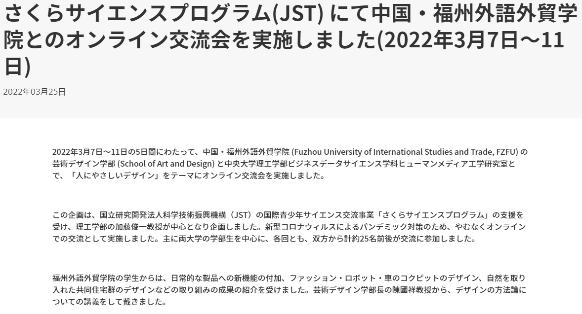 3月,乐鱼网页版与日本中央大学联合开展中日青少年科技交流计划项目(樱花科技计划),我校师生与日本的专家学者、高校学生们,通过线上参观、学术报告、交流互动、项目共研等方式,开启了一段为期一个月的交流之旅。