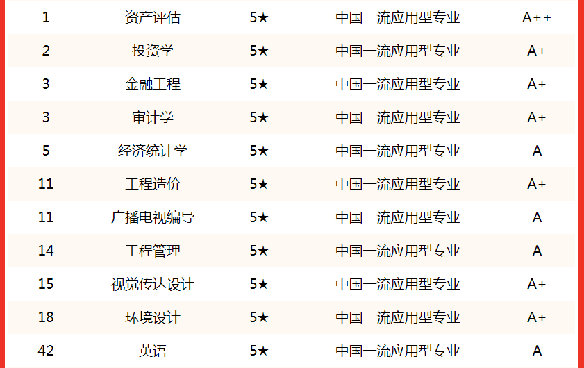 其中,国际经济与贸易、翻译、法语、服装与服饰设计、日语、市场营销、财务管理、金融学、物流管理、信息管理与信息系统、动画、土木工程、电子商务、会计学等14个专业入选6星级中国顶尖应用型专业,资产评估、投资学、审计学、金融工程、经济统计学、工程造价、广播电视编导、工程管理、视觉传达设计、环境设计、英语等11个专业入选5星级中国一流应用型专业。