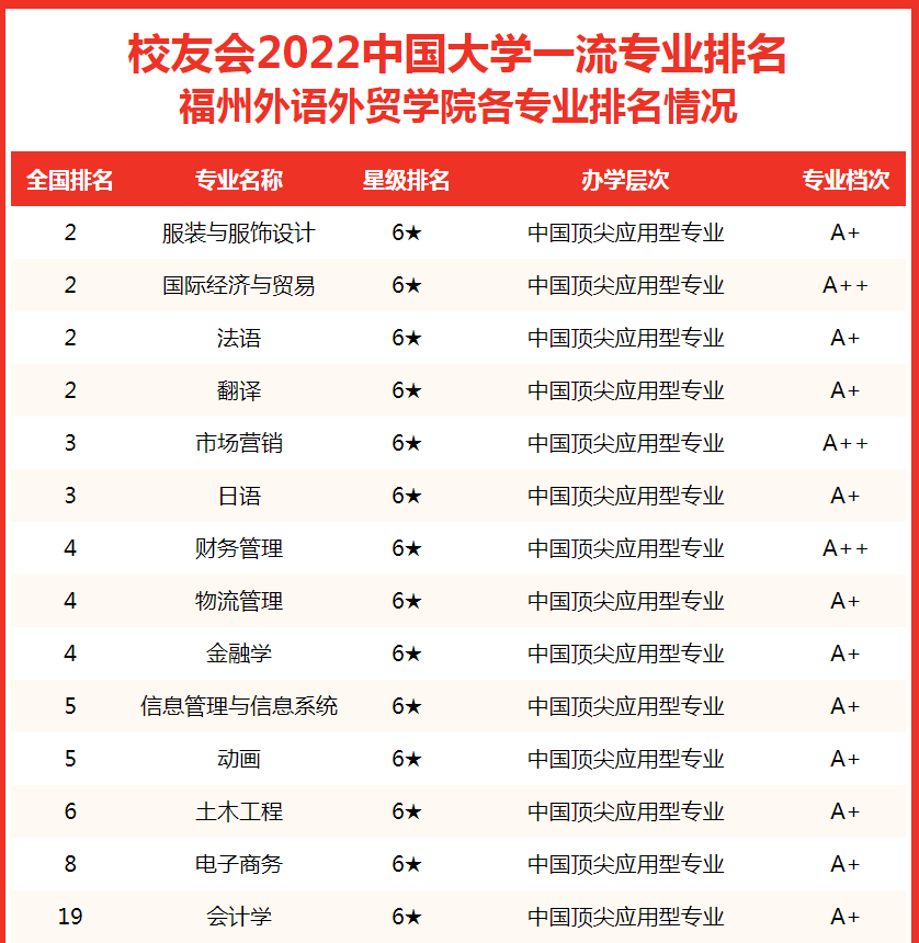 近日,艾瑞深中国校友会网最新发布校友会2022中国大学一流专业排名,本次共有全国1236所本科高校的近6万个本科专业参评,公民办高校同台竞技。我校在校友会2022中国大学一流专业排名(应用型)中位列公民办高校第42位,在全国财经类大学一流专业排名(应用型)中位列公民办高校第7名,在福建省大学一流专业排名(应用型)中位列公民办高校第3位,整体排名再次跃升。