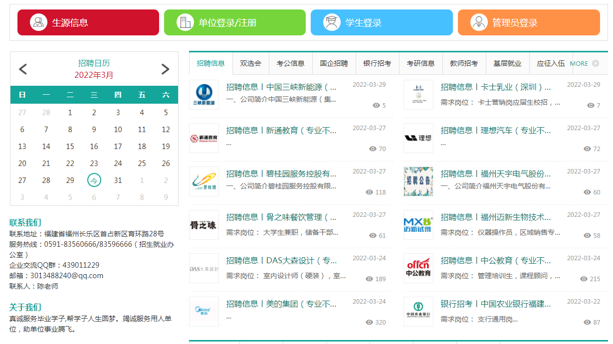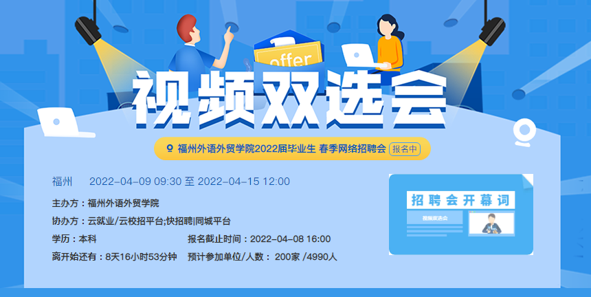 疫情防控期间,疫情防控期间,学校就业部门联合校团委主动联系团省委、福建青年人才开发中心等,邀请各用人单位通过“云招聘”网络视频面试招聘平台开展“千校万岗,就业有位来”2022届毕业生专场网络招聘会招聘会。本次招聘会就业岗位多、层次高、领域宽、分布广,共吸引185家企业参会,提供就业岗位达5487个,近1000名毕业生达成初步意向。