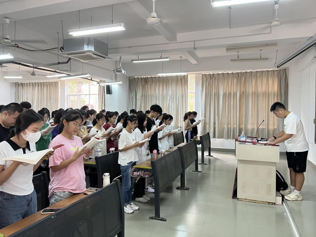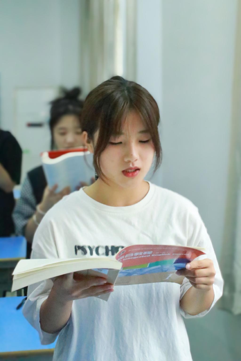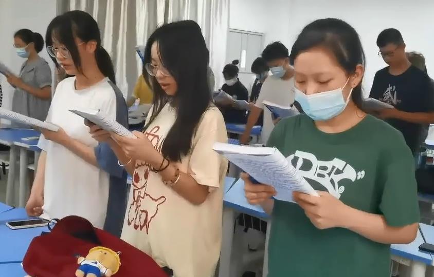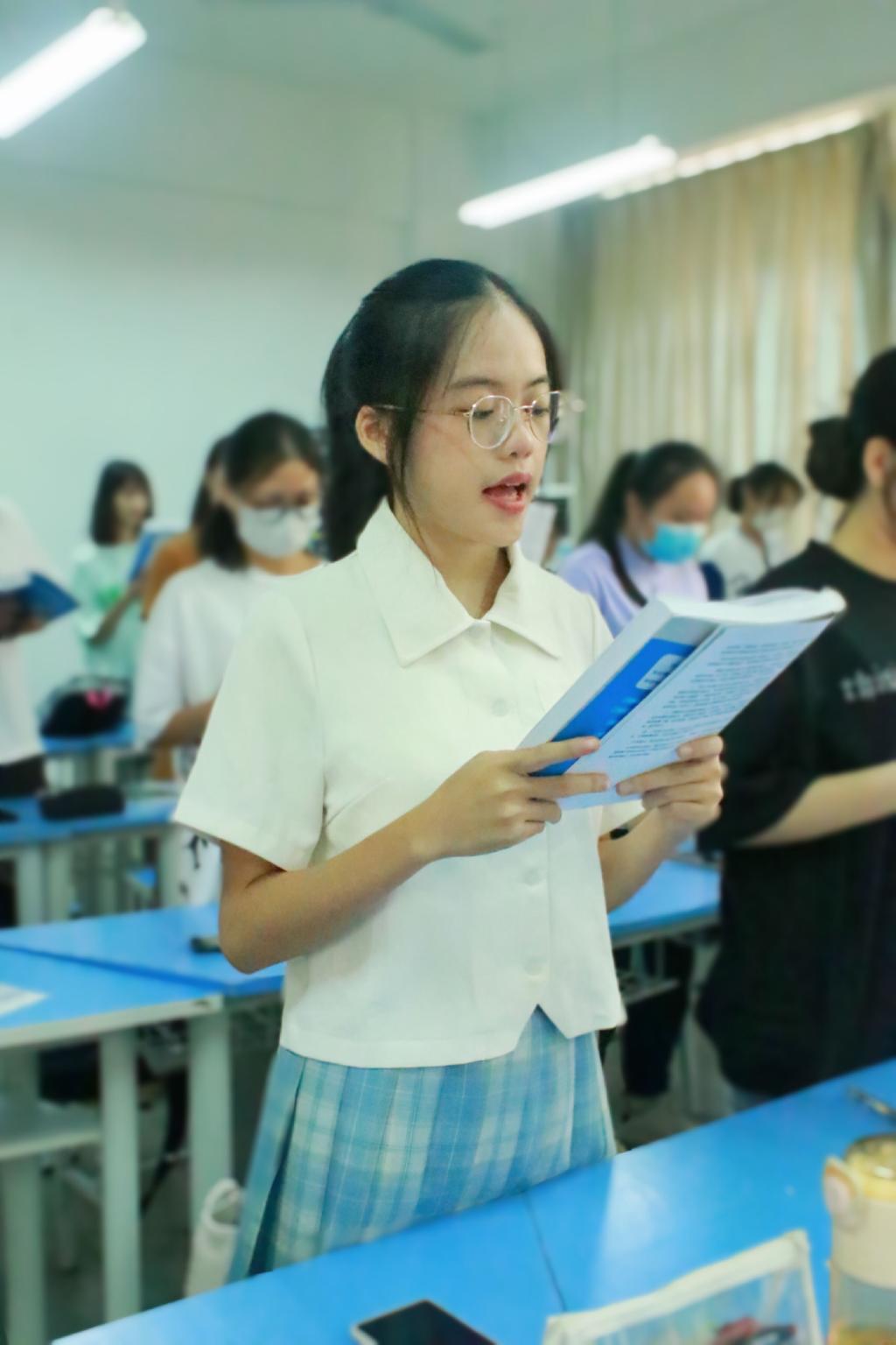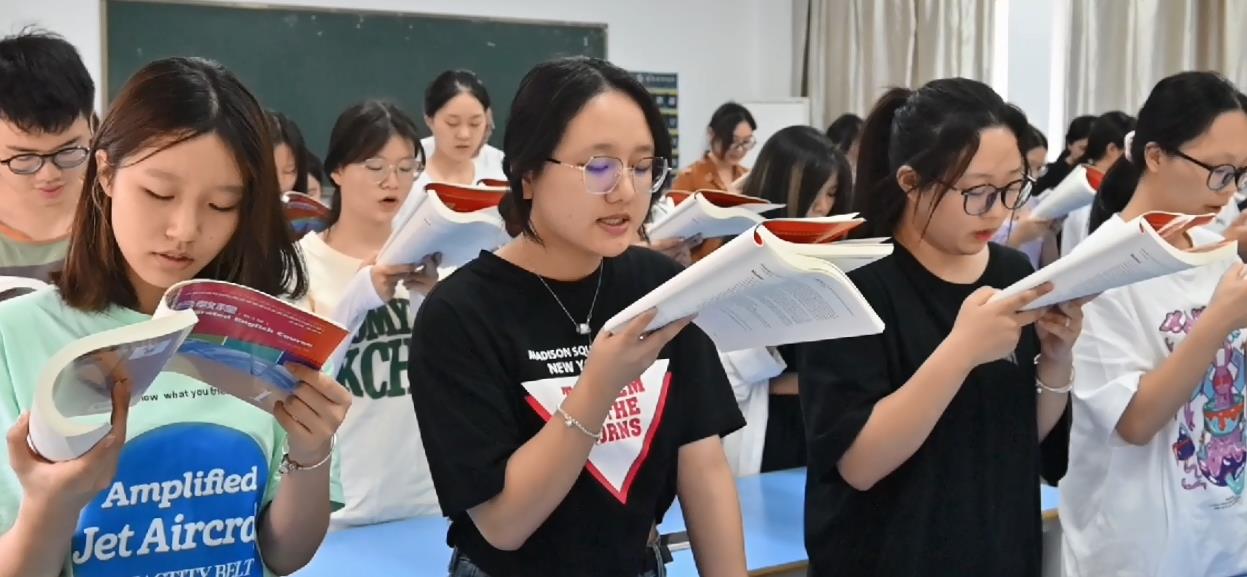 教室内,学长学姐们用流利饱满的语音、良好的精神面貌感染着学弟学妹们。新生们也整齐地跟读,朗朗的读书声回荡在清晨的校园,为校园注入了第一抹生机与活力。