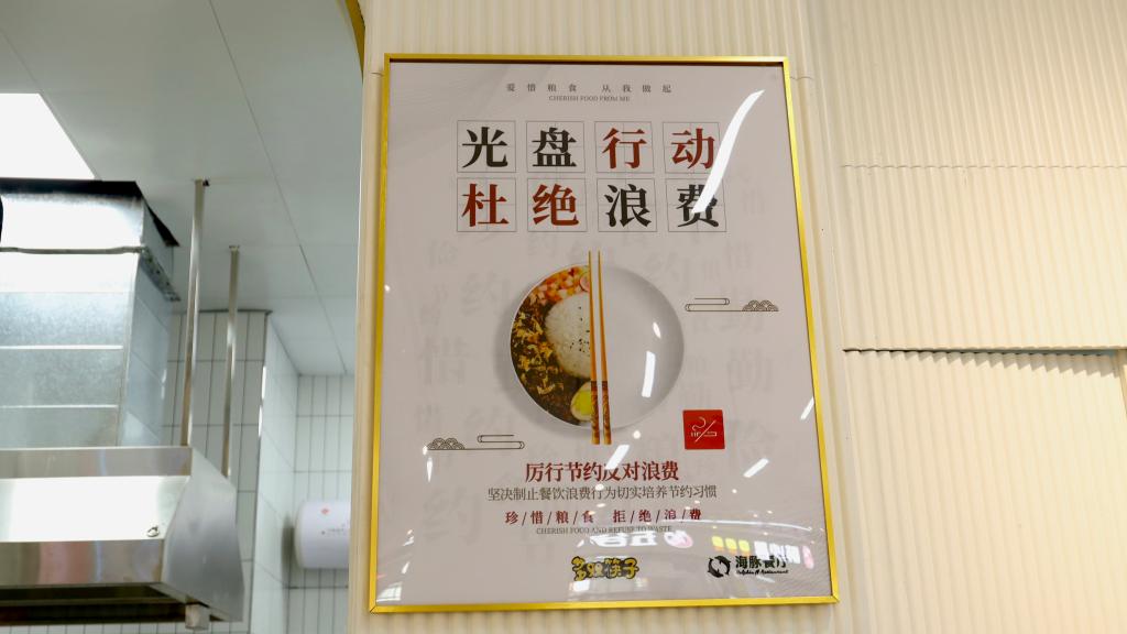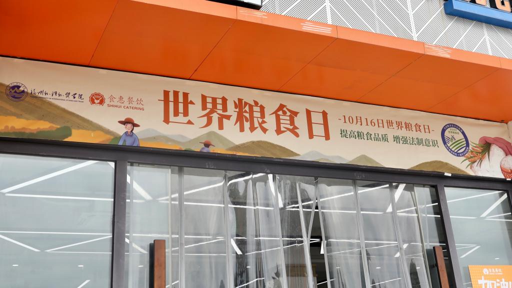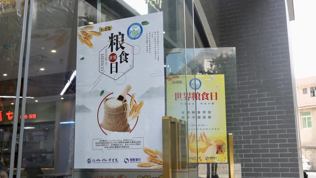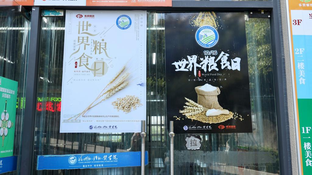 学生餐厅里,食堂门口、墙上随处可见“世界粮食日”“珍惜粮食”“光盘行动”等宣传标语。