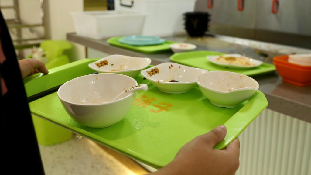 一份行动,彰显着节俭的魅力。在餐厅的餐具回收处可以发现,送回来的餐盘大部分都是光盘。