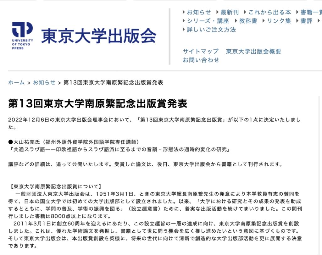 近日,我校外国语学院教师大山祐亮副教授的论文《原始斯拉夫语:从原始印欧语到斯拉夫语族的音系与形态的历史演变研究》获第13届东京大学南原繁纪念出版奖,大山祐亮为该奖项本年度唯一获奖者。