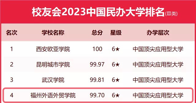 4月6日,全国第三方大学评价机构艾瑞深校友会网正式发布《校友会2023中国大学排名:高考志愿填报指南》,公布了校友会2023中国大学排名、中国民办大学排名等榜单。榜单显示,我校以99.7分位列“校友会2023中国民办大学排名(III类)”第4位,蝉联福建第一,稳居中国顶尖应用型大学行列。我校已连续5年在该榜单中名列省内第一,是国内办学水平最高的财经类民办高校之一。