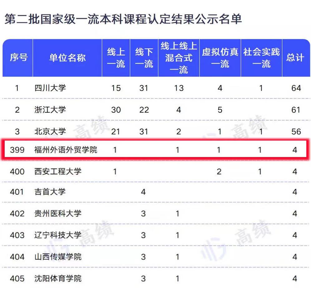近年来,学校聚焦“外+” 办学特色和“信息技术+”人才培养特色,大力推进“金专”“金课”建设提质量、上水平。截至目前,我校共有6门课程入选国家级一流本科课程,实现了线上一流课程、线下一流课程、线上线下混合式一流课程、社会实践一流课程、虚拟仿真一流课程5种类型全覆盖。